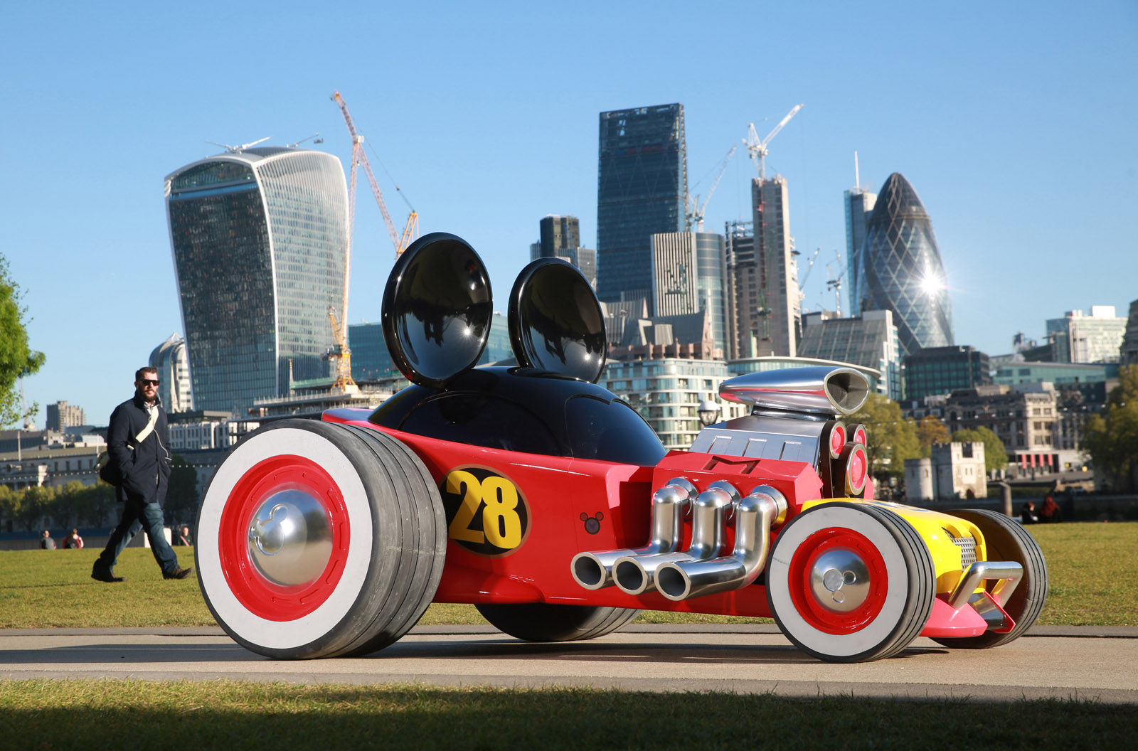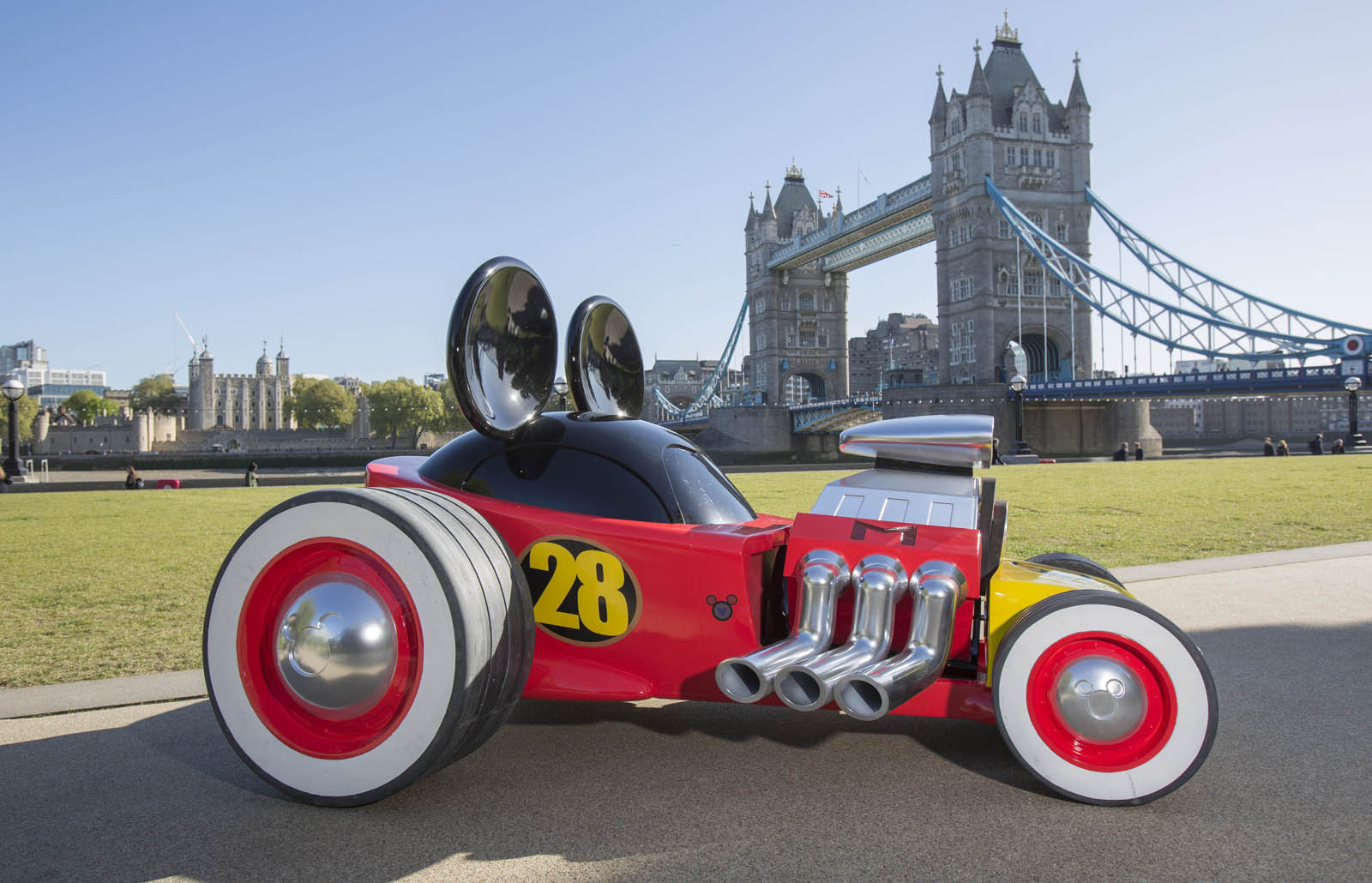 Built to scale in real life, Mickey’s Roadster Racer stretches nearly eight feet long (shorter than a Smart Fortwo) and took more than three months to complete. The life-size mockup features what looks like a V6 up front driving a rather fat set of wheels at the back, with a pair of Mickey ears perched atop the canopy roof (looking rather un-aerodynamic), and the number 28 in reference to the year in which everyone’s favorite cartoon mouse made his big debut in the breakout animated short Steamboat Willie nearly 90 years ago.