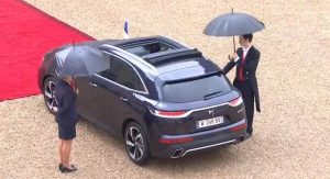 The Presidential DS 7 is done up in a special ink-blue paint, with a black leather interior, official state insignia and flags, and gold details on the wheels and in the cabin. Most unique about this particular DS 7, though, is the roof: the state limousine has a convertible top to transform the crossover into a parade car so that the gathered masses on the Champs-Elysées can catch a glimpse of their new head of state – even in the rain.