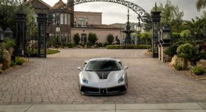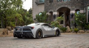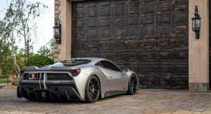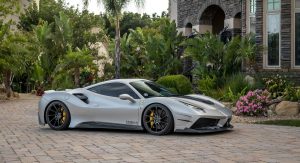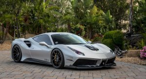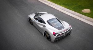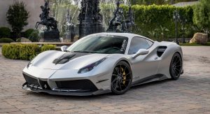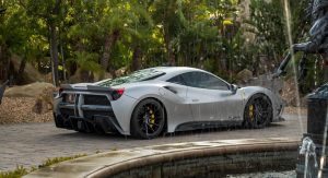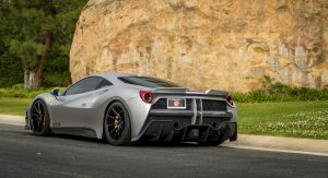 The bodykit includes a split ducktail spoiler, totally new grilles, a carbon diffuser, twin exhaust pipes and two body-colored elements running vertically down the middle of the rear. When combined with the matte grey finish and black wheels of this display car, you have one of the craziest 488’s we’ve ever laid eyes on.