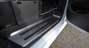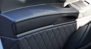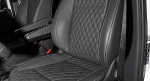Providing a unique look throughout the cabin are the leather-lined front and rear door panels, tailgate, decorative parts in the dashboard (with a matte black carbon design), door sill protectors, and pedals.
