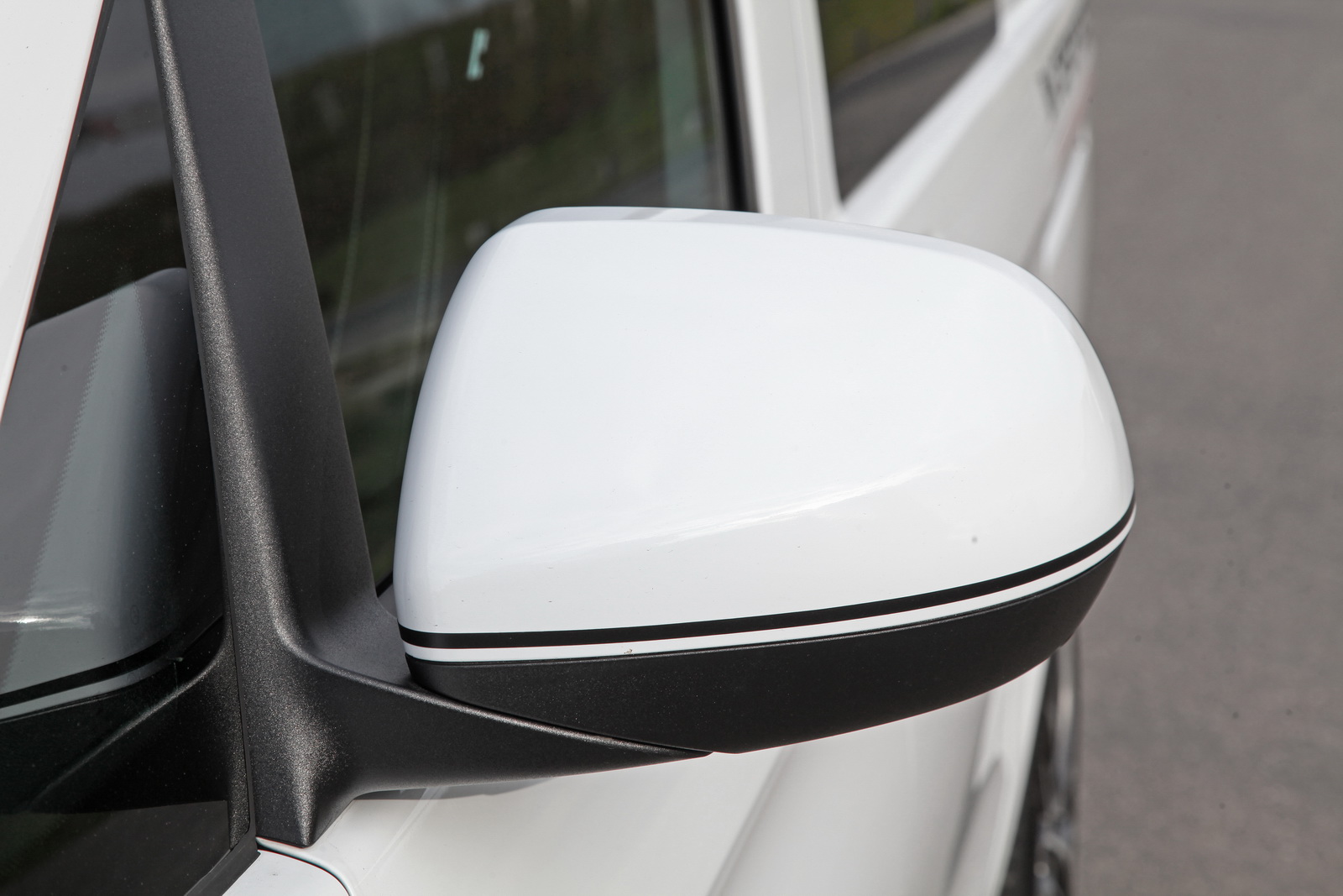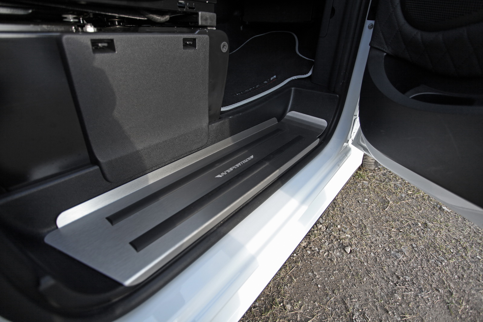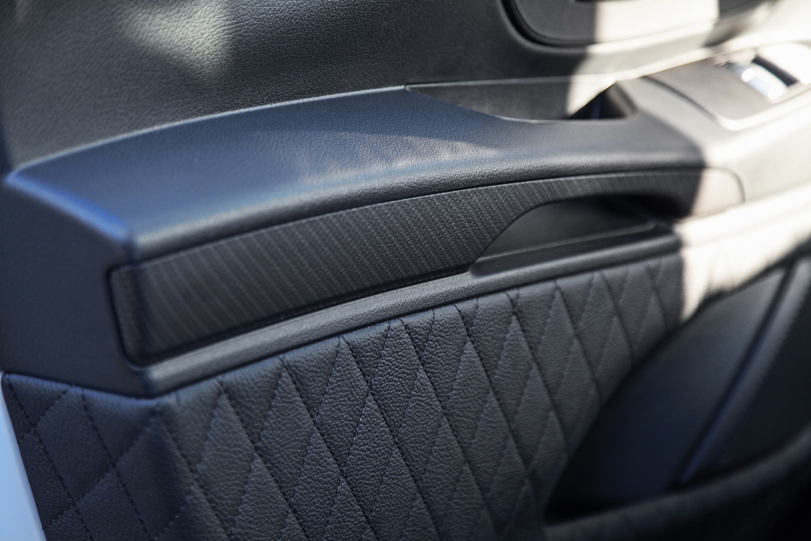 Providing a unique look throughout the cabin are the leather-lined front and rear door panels, tailgate, decorative parts in the dashboard (with a matte black carbon design), door sill protectors, and pedals.