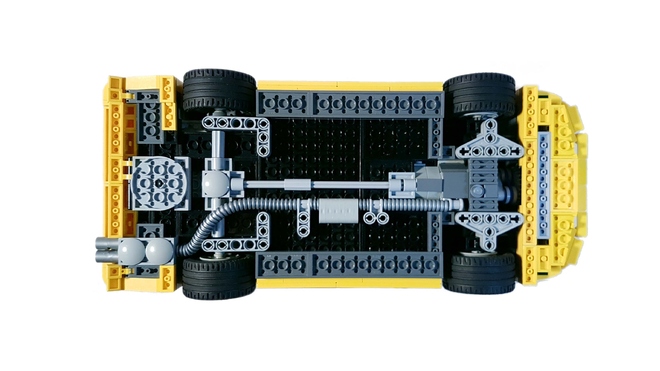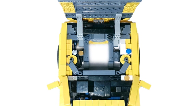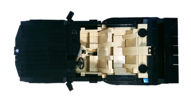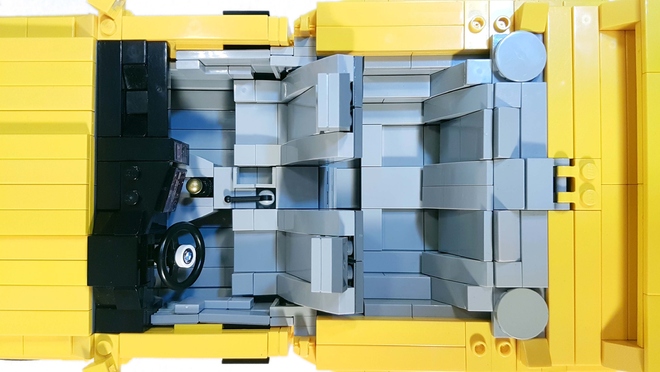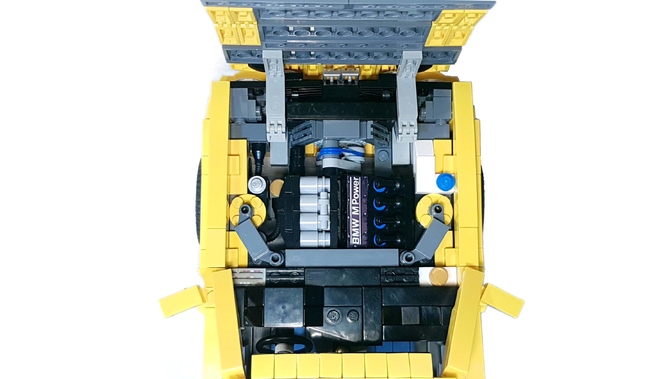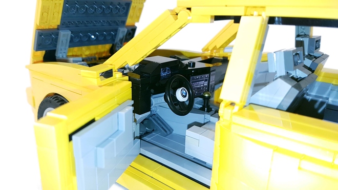 The trunk can also be opened, and so can the hood, which hides a replica of the original engine, made from the same small bricks.