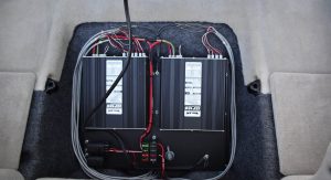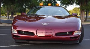 Decked out in a deep wine red with gold wheels and 50th-anniversary badging, the very special Vette features a 5.7-liter V8 rated at 350 horsepower, magnetorheological suspension, unique graphics, emergency lighting bar, on-board fire extinguisher, roll cage, racing harnesses… the works.