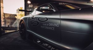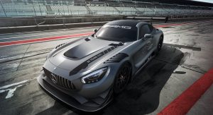 Based on the Mercedes-AMG GT3 race car, the Edition 50 features a bespoke gray paint job with contrasting black stripes on the hood. The model also has “50 Years AMG” badging on the doors, seating harnesses, and hood.