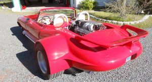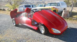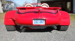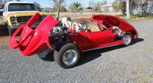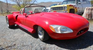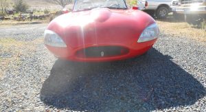 We’re not entirely sure what this thing is supposed to be. Perhaps a sort of half E-Type dragster, half Bond(o) car. We do know that it sort of looks like a whale shark and that sheet metal was used for all the body mods.