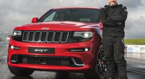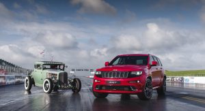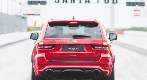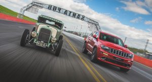 In the other lane is a new Jeep Grand Cherokee – not the new Trackhawk model with the supercharged Hellcat engine, but the “standard” SRT model with its 6.4-liter V8. It’s substantially more potent at 468 hp, but that muscle has to move more machine, with five seats, a whole lot of cargo space, and all the trimmings. Then again, the four-wheel drive only helps it get the power down to the tarmac.
