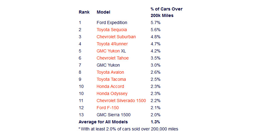 After analyzing over more than 13 million vehicles, the research firm determined what percentage of models had over 200,000 miles (320,000 km) on the odometer.