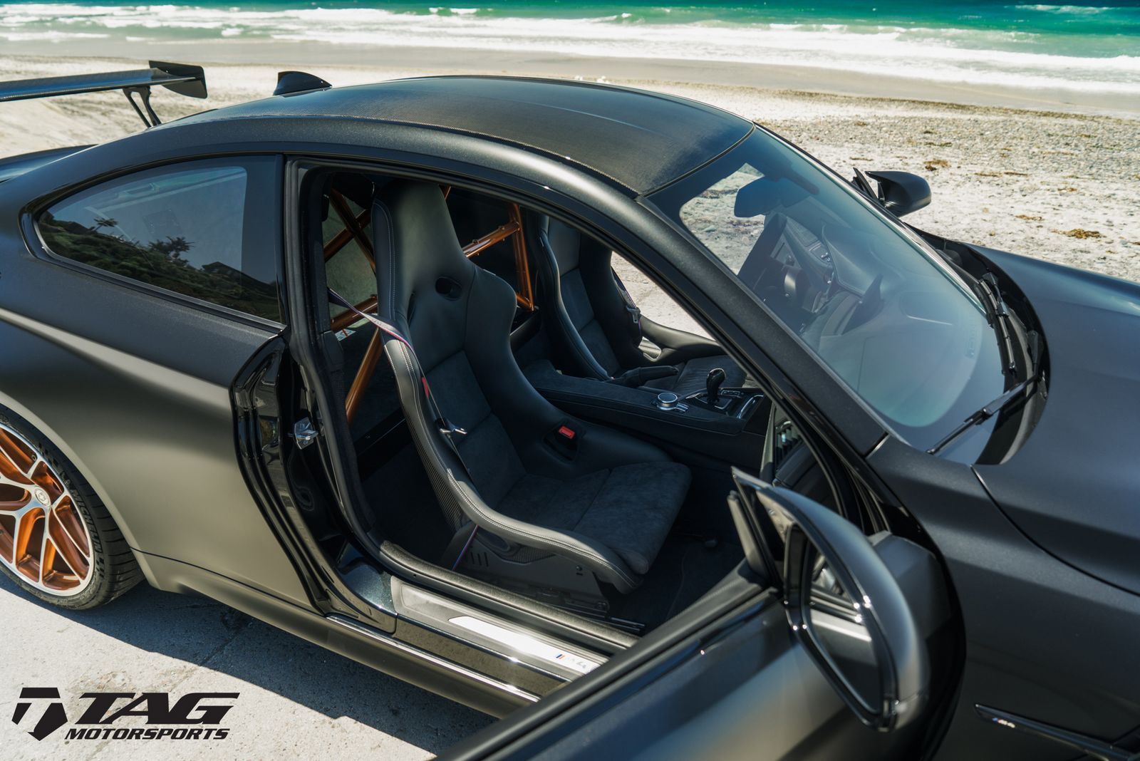 For starters, the Sapphire Black Metallic paint has been adorned in a protective bra that not only protects it but makes the paint appear as if it was matte black. Elsewhere, the track-focused M4 has been installed with a huge rear wing that ascends far higher into the sky than the wing usually found on the car.