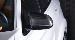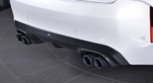 The kit consists of new custom fenders, new front and rear spoilers, a carbon fiber rear diffuser, sports tailpipes, rear wing, carbon fiber mirror covers and a set of single-spoke custom wheels with blue calipers.