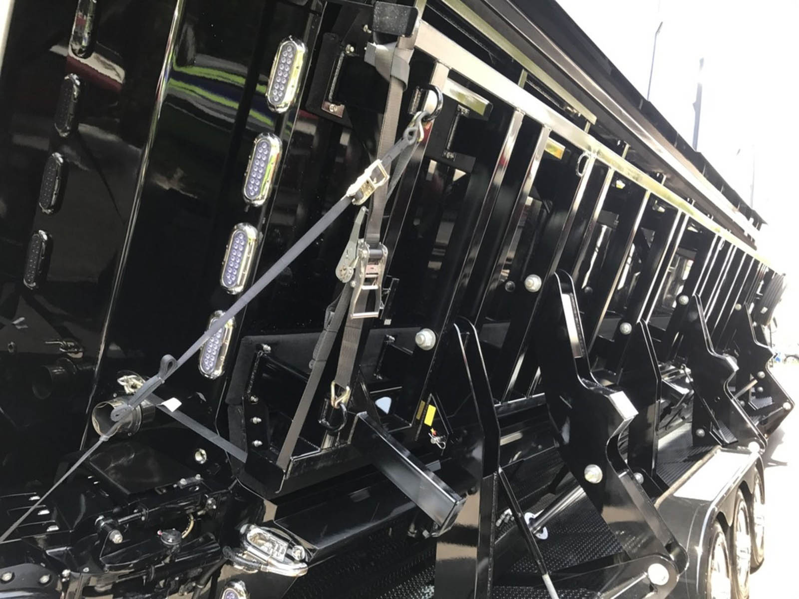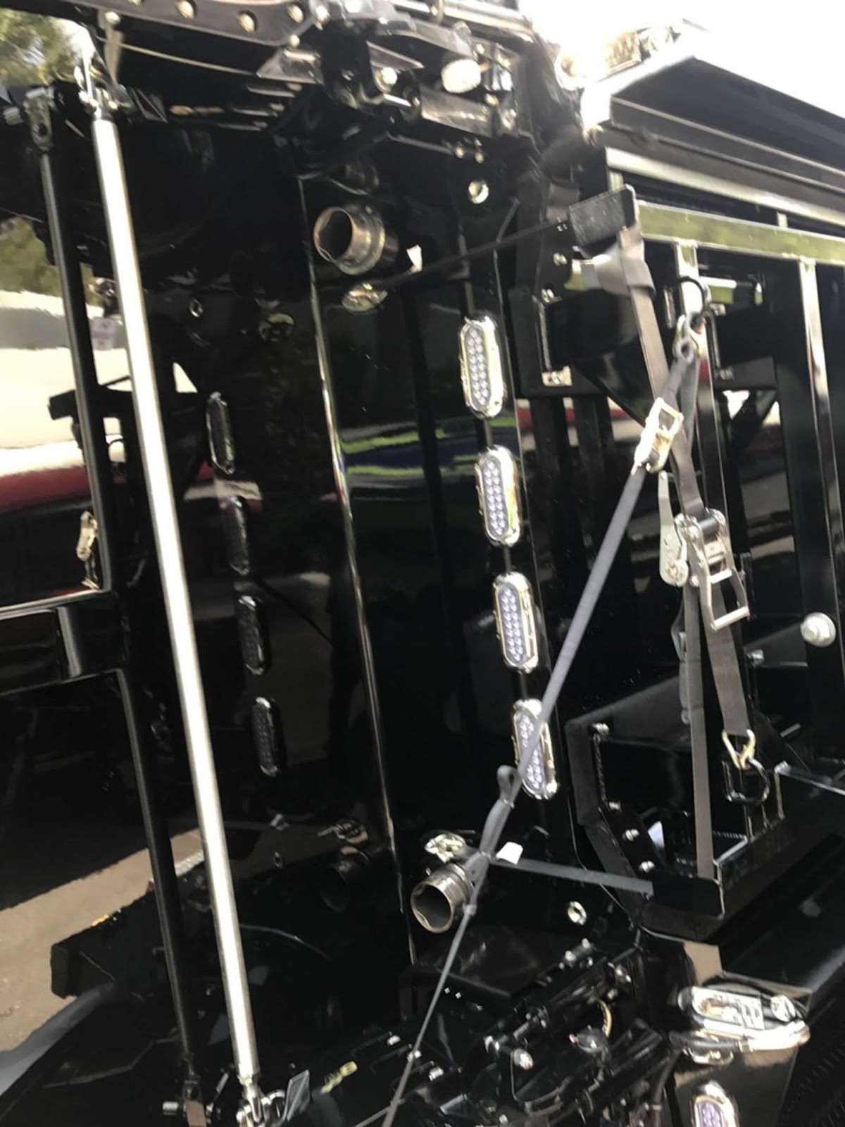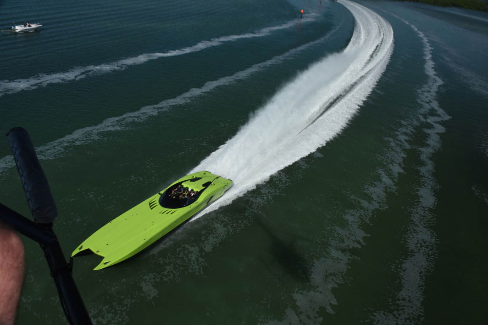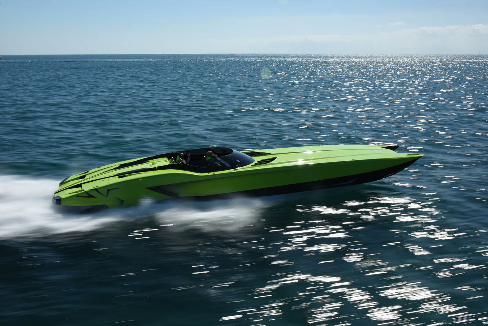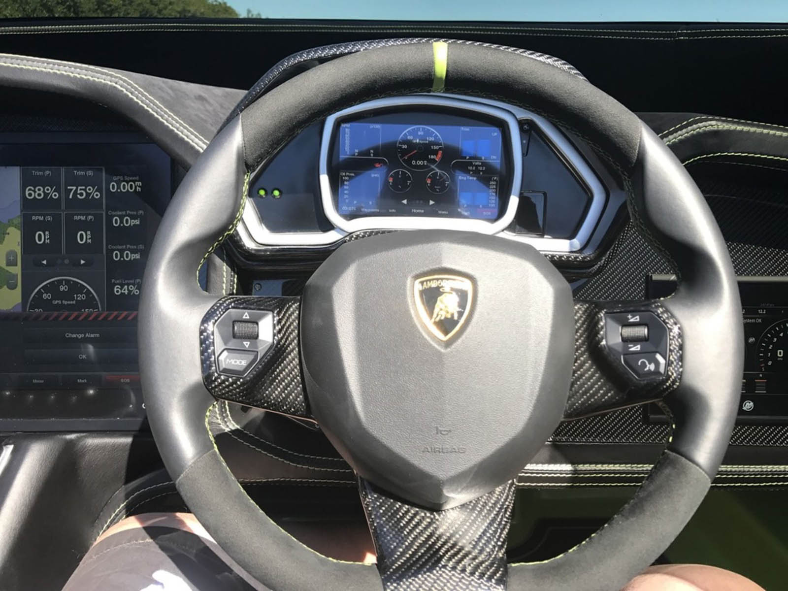 This 52-foot MTI G6 is done up inside and out in the same special shade of Verde Singh as the supercar, with coordinating Alcantara upholstery, carbon-fiber trim… the works. It even wears the door panels, lighting, steering wheel, and marinized switchgear from the Aventador. Oh, and there’s the small matter of the engine: not one of Lamborghini’s own maritime mills, but a single Mercury Racing engine that’ll kick out 1,350 horsepower on 91-octane gasoline, or 1,550 on 112 AKI race fuel. That’s said to be enough to propel the carbon-fiber catamaran to a top speed of 180 miles per hour on the open water.