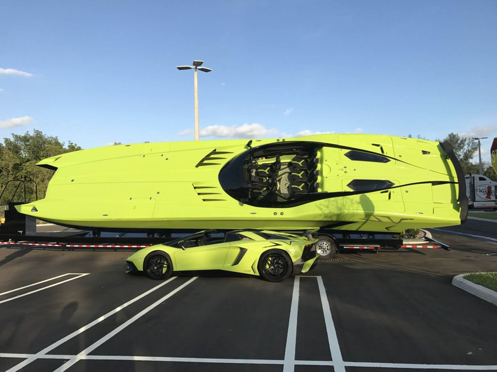 Why, you buy a speedboat to match, of course! And that’s just what we have here. Listed for sale via JamesEdition in Fort Lauderdale is an Aventador SV Roadster with a matching catamaran. And we do mean matching.