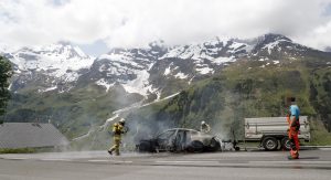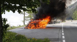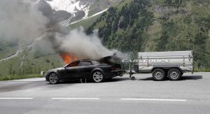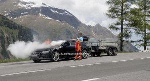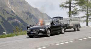 Apparently this Audi A7 mule suffered from some sort of catastrophic failure while pulling a dead weight trailer up the Alps and flames started shooting from between the hood and the windshield.