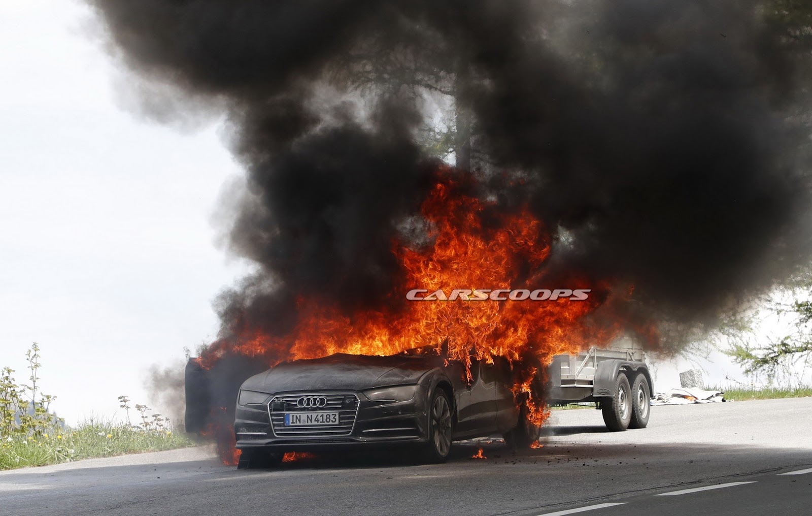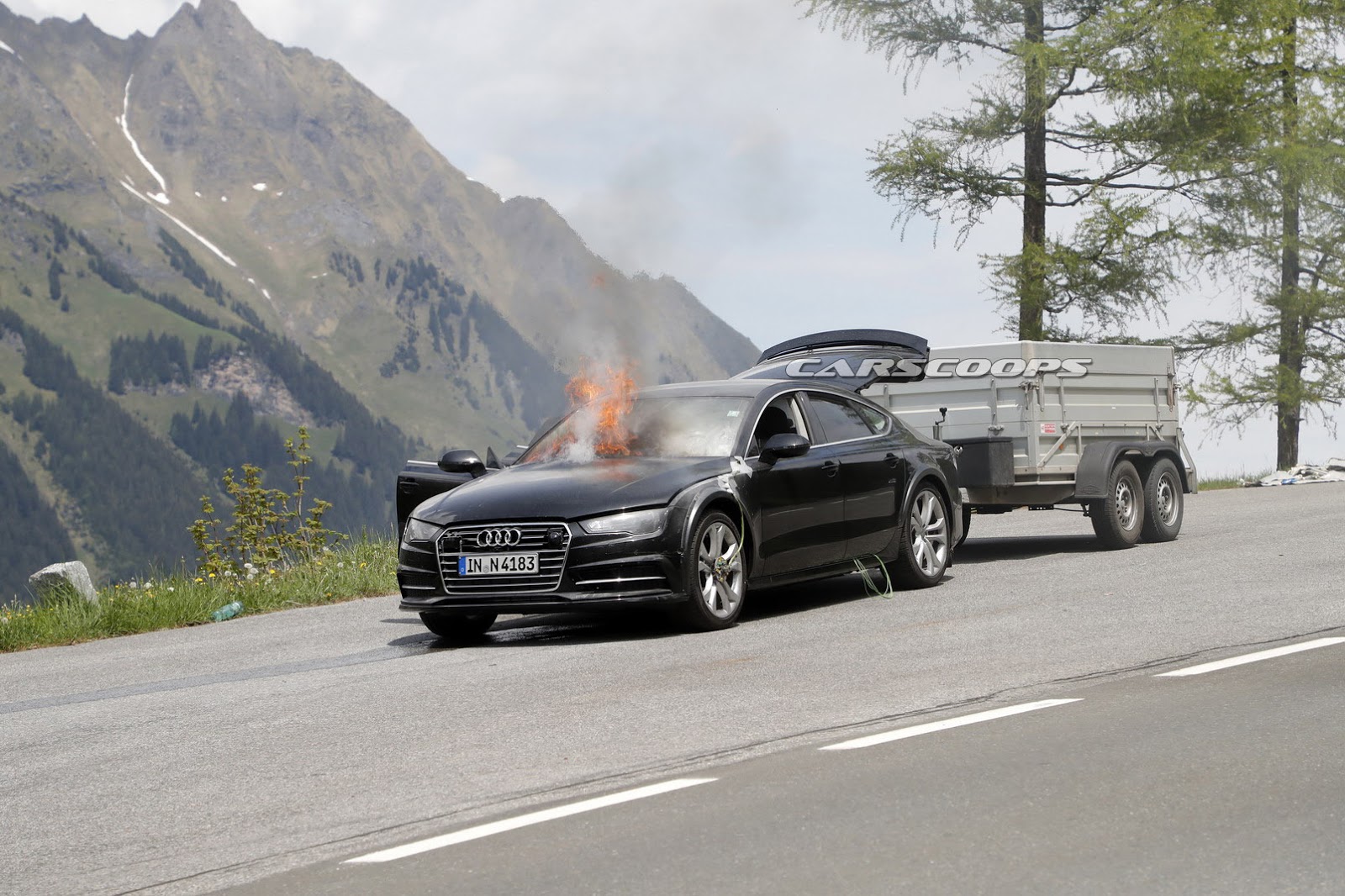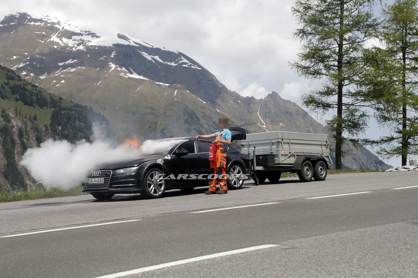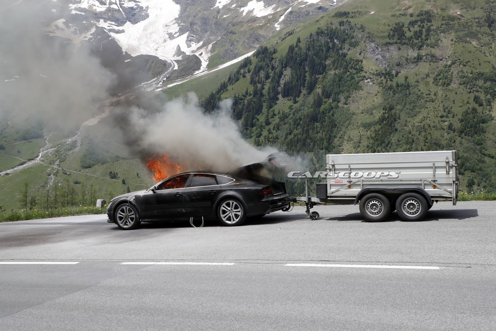 Apparently this Audi A7 mule suffered from some sort of catastrophic failure while pulling a dead weight trailer up the Alps and flames started shooting from between the hood and the windshield.