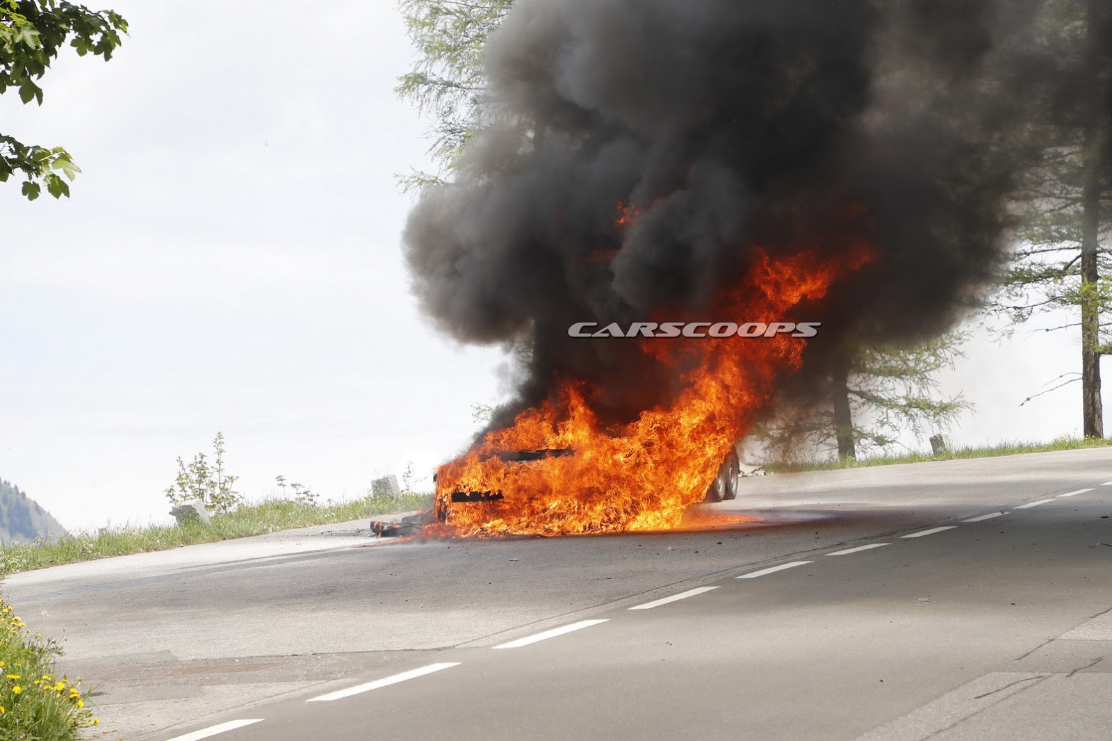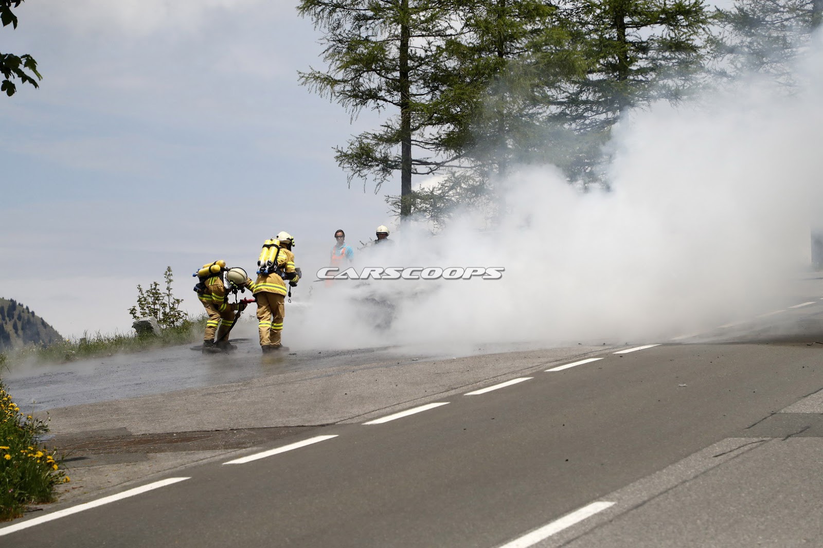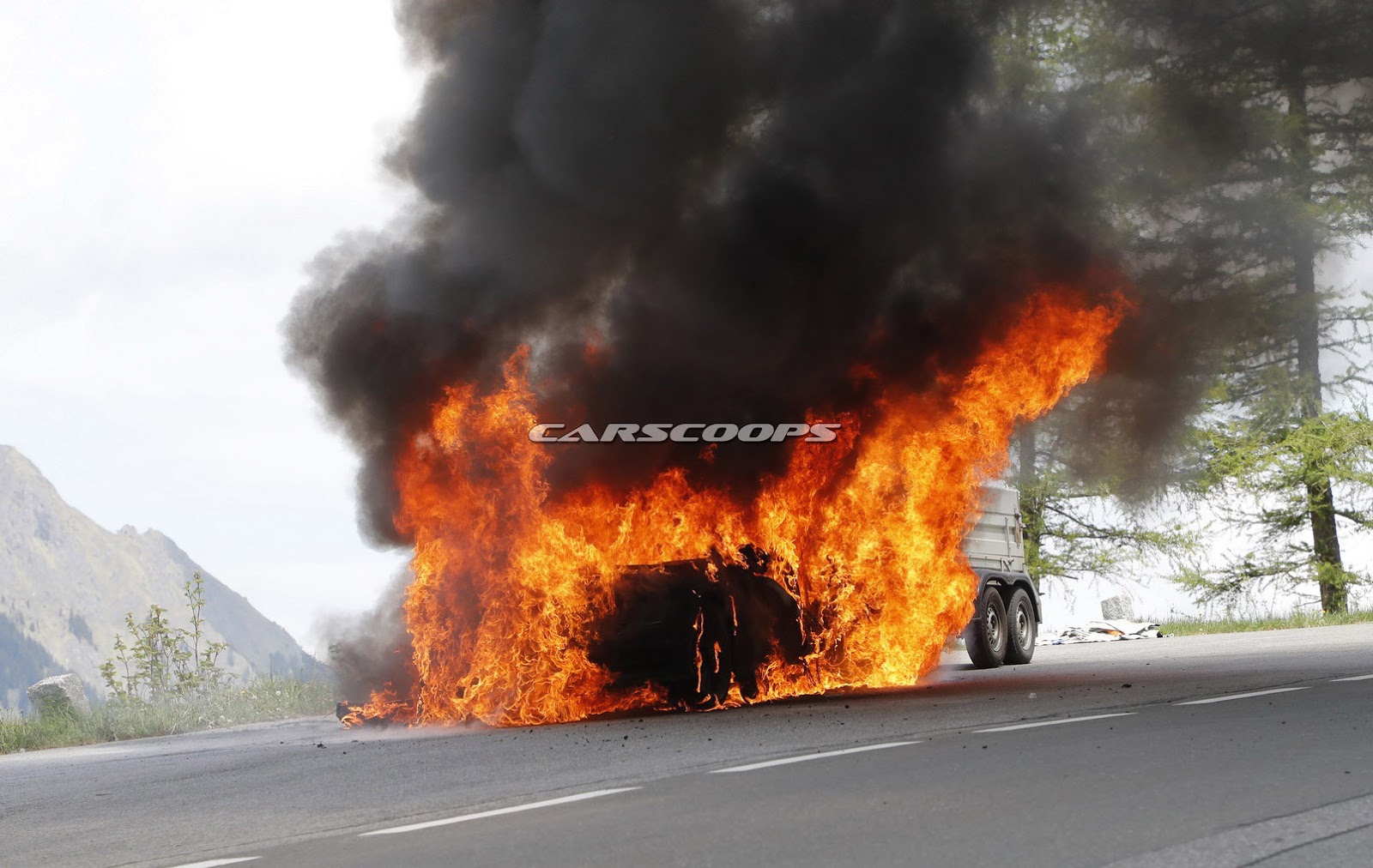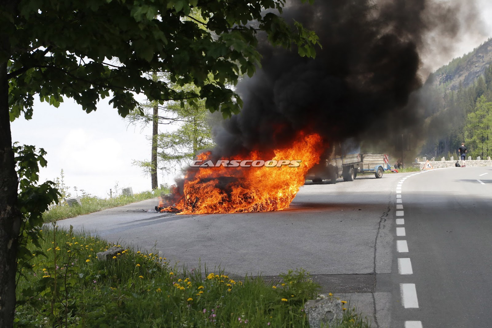 Apparently this Audi A7 mule suffered from some sort of catastrophic failure while pulling a dead weight trailer up the Alps and flames started shooting from between the hood and the windshield.