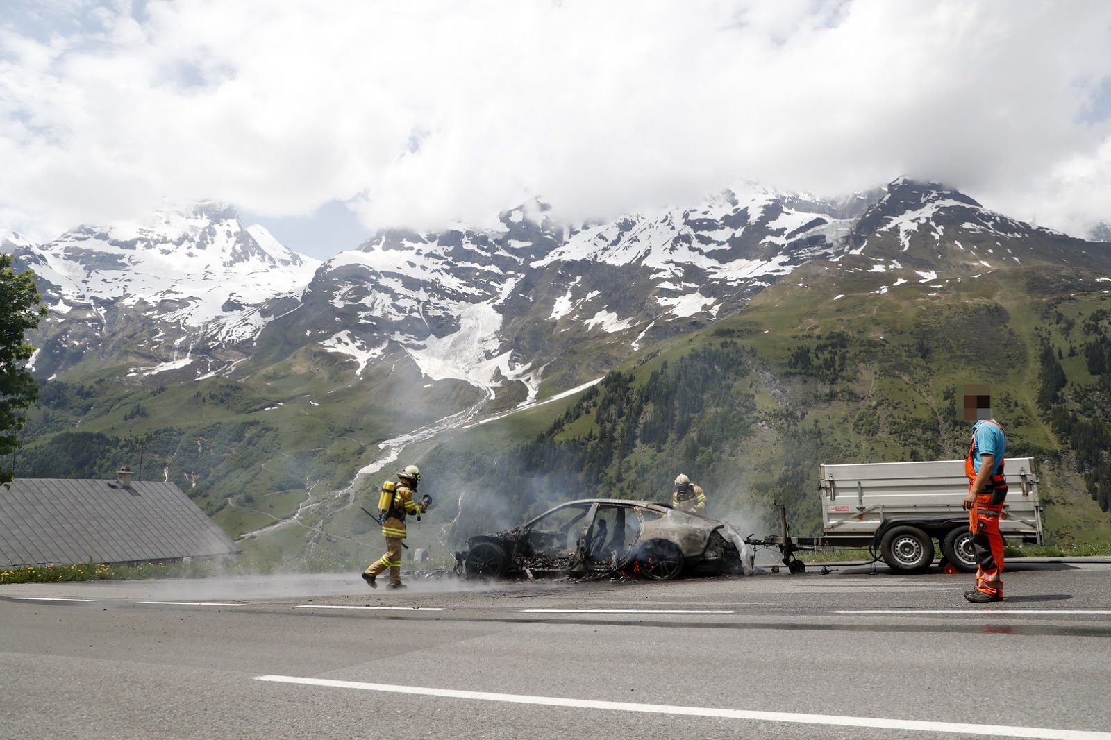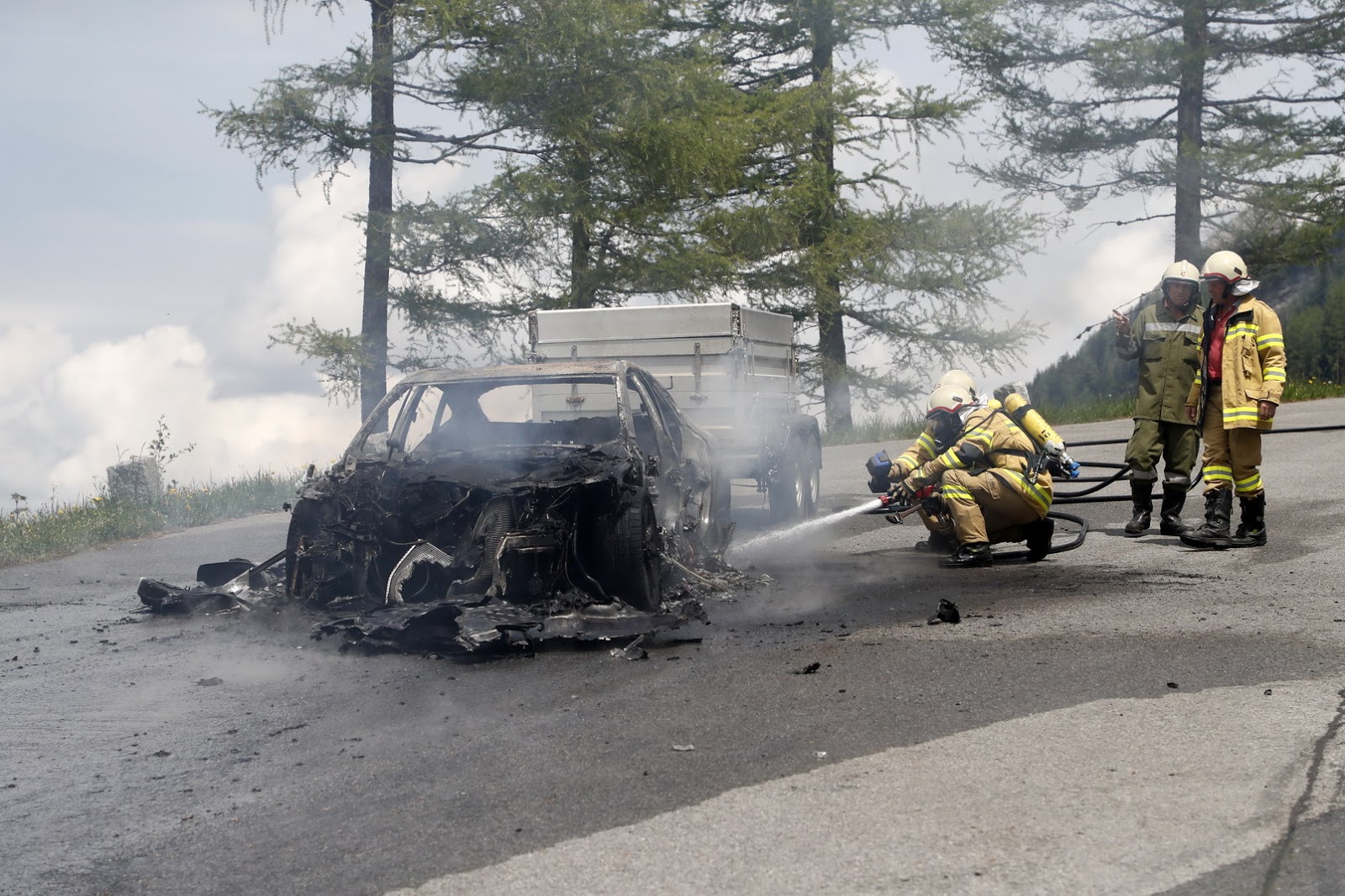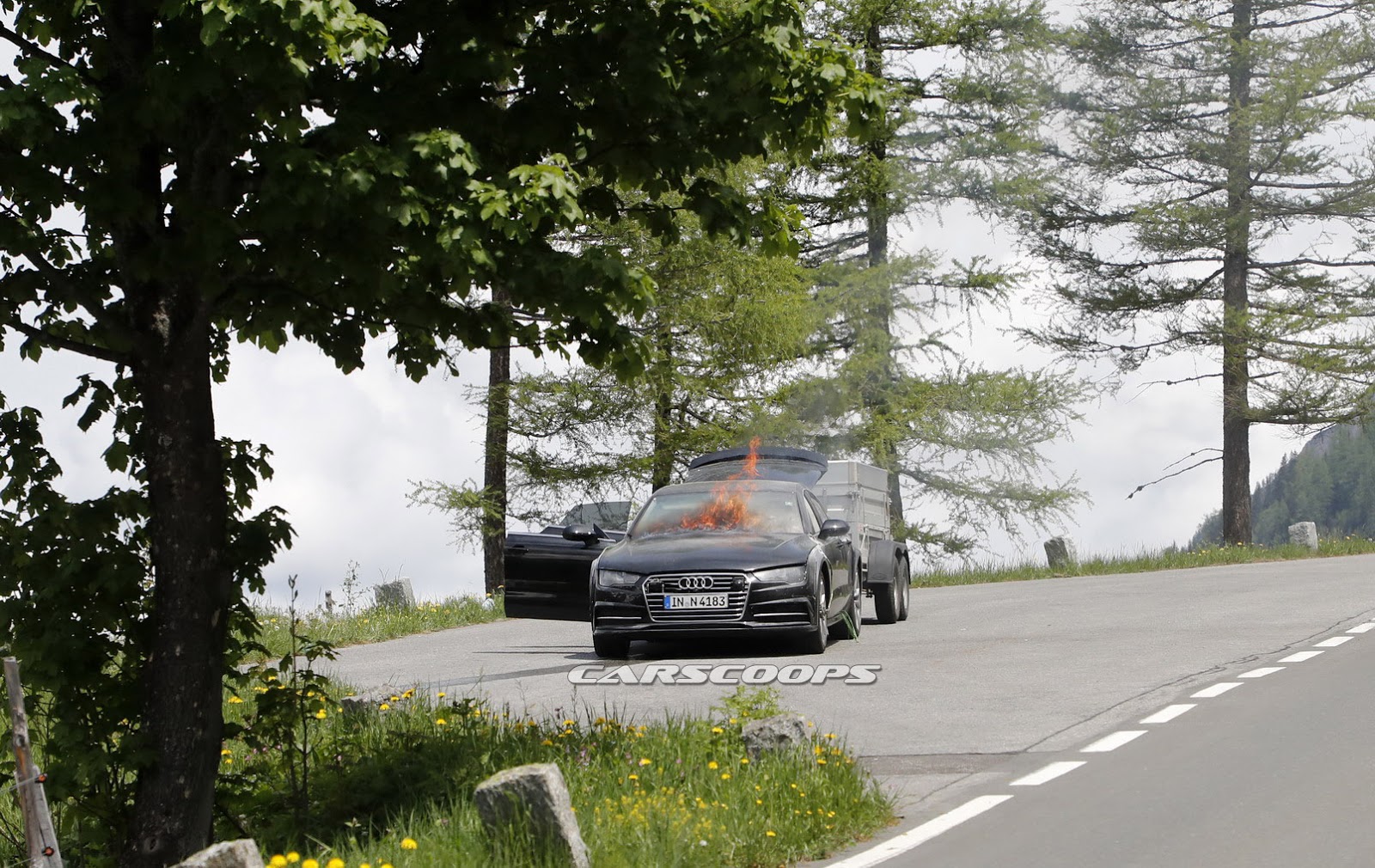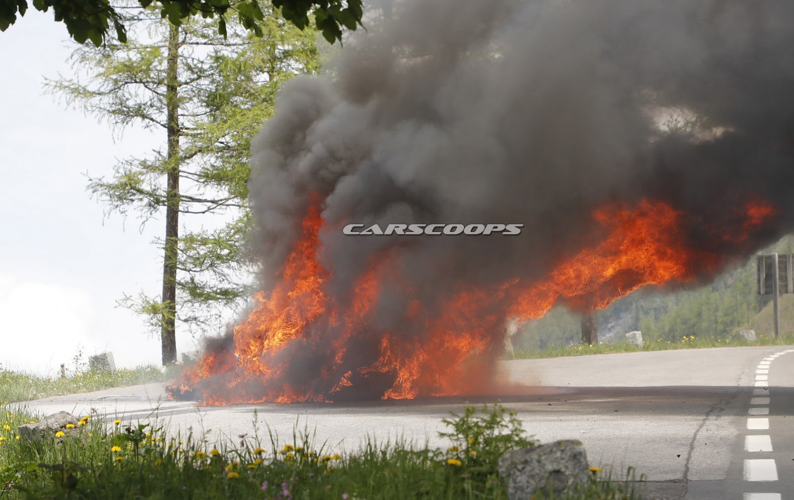 Apparently this Audi A7 mule suffered from some sort of catastrophic failure while pulling a dead weight trailer up the Alps and flames started shooting from between the hood and the windshield.
