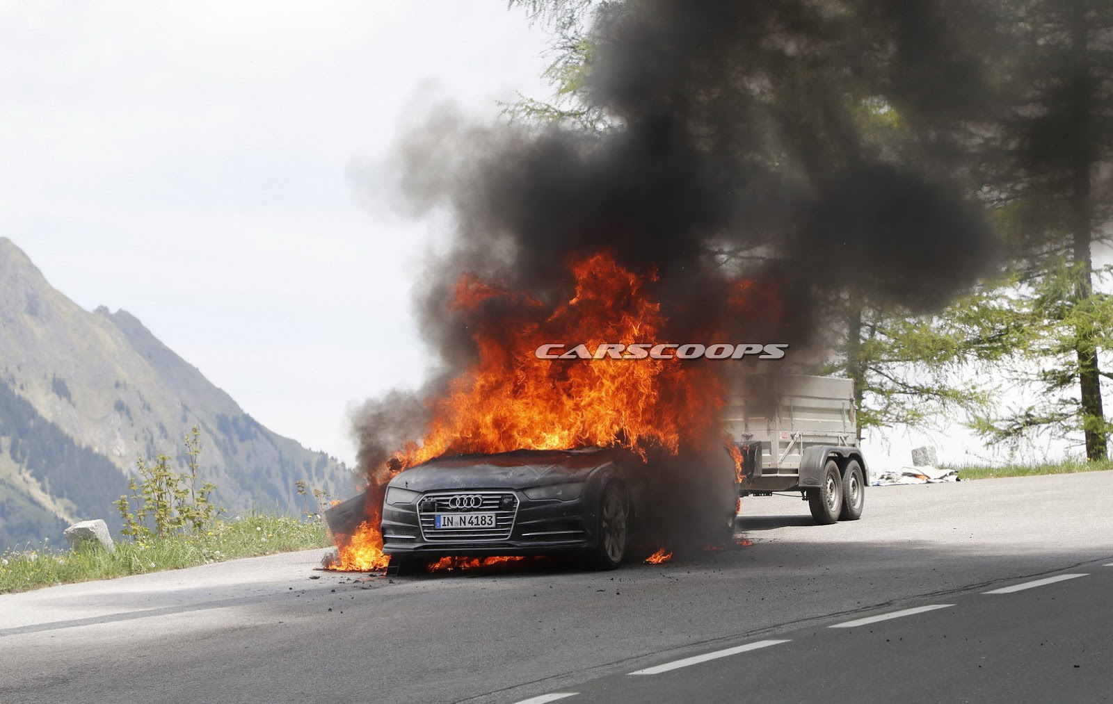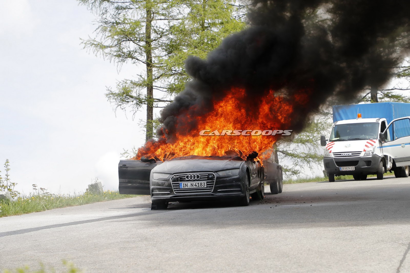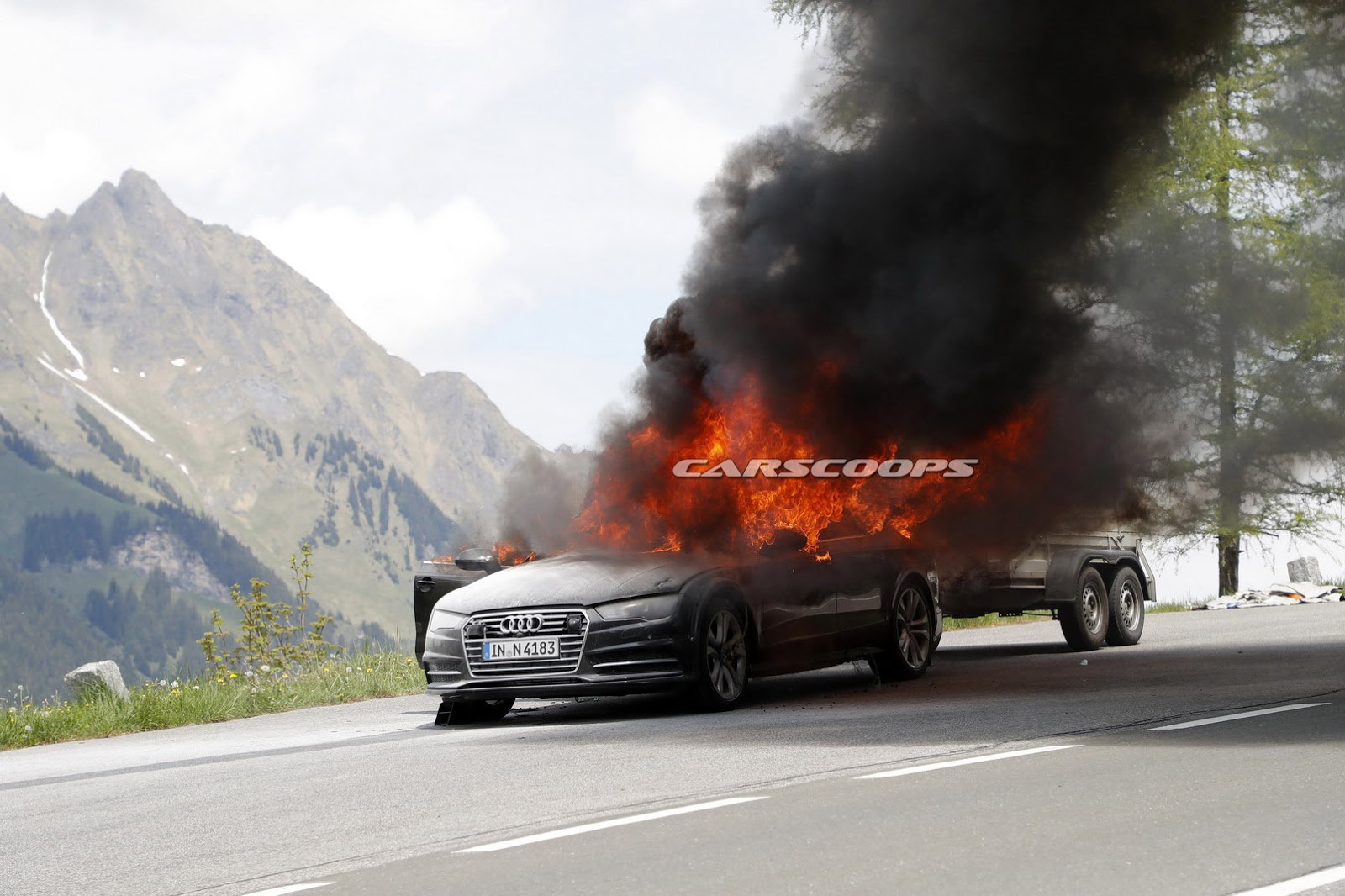 Audi’s engineers were testing a prototype of the 2019 A7 in the Austrian Alps, when suddenly the car caught fire in front of our spy’s camera.