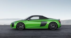 Exclusive to the new Audi R8 V10 Spyder Plus is the micrommata green paint, which is joined by the anthracite gray single frame grille, black tailpipe covers, standard 19-inch wheels or optional 20-inch ones, and a predominantly black interior, with Nappa leather, green stitching, and special floor mats.