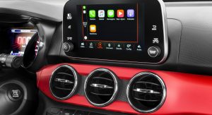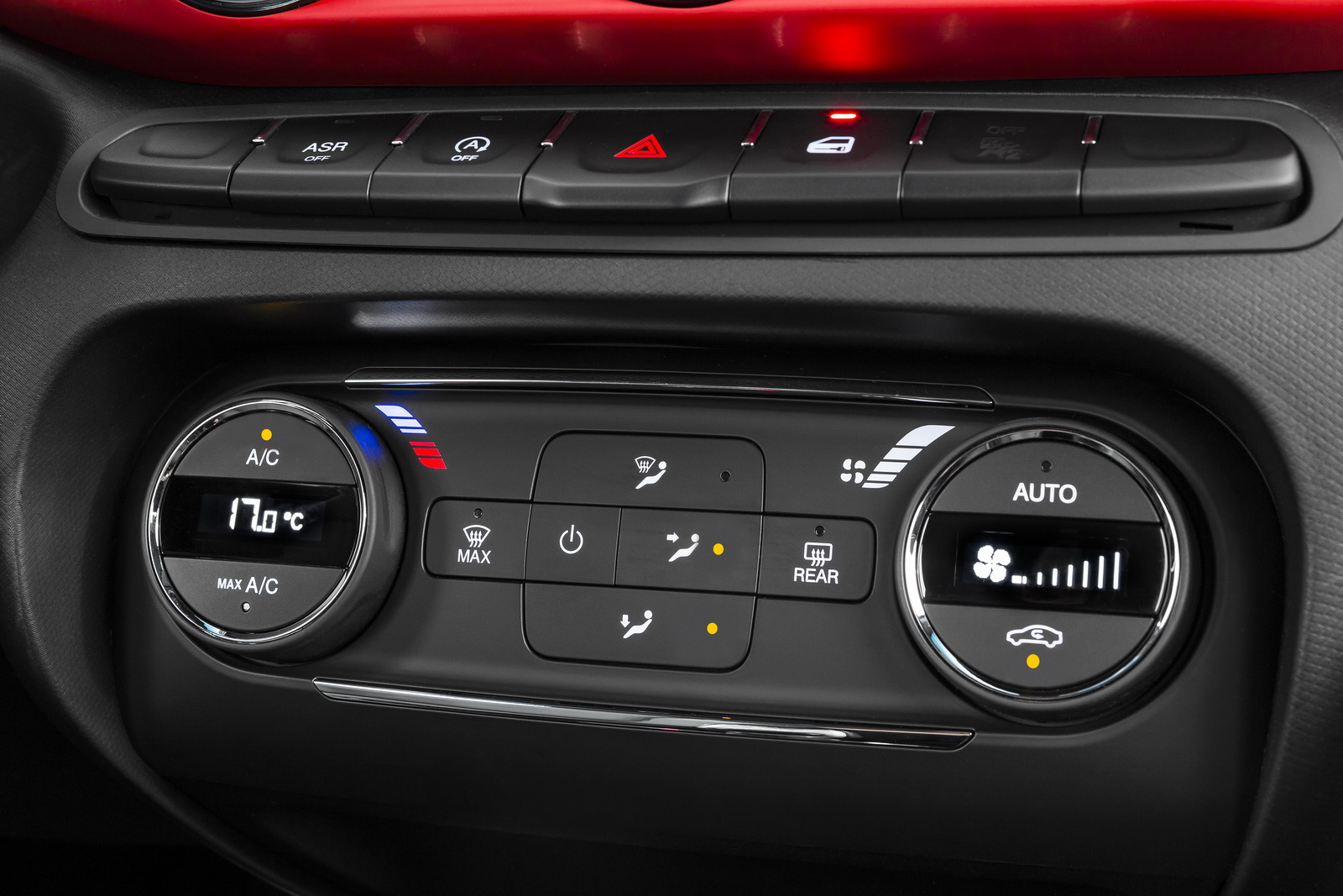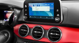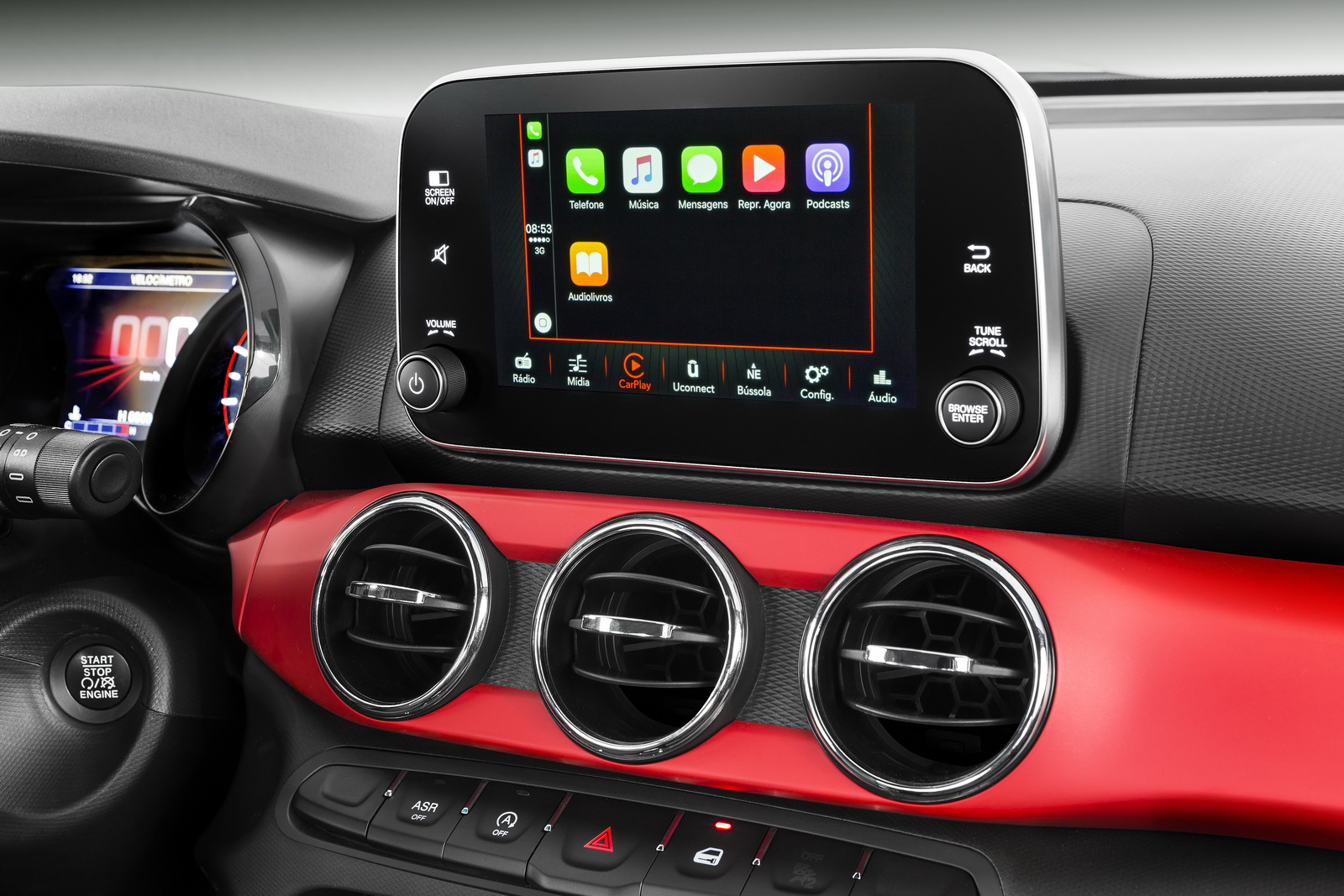 The dashboard follows a layout that looks awfully similar to that in the Mercedes A-Class, featuring three circular air-vents mounted a painted strip that runs from side to side and a floating seven-inch touchscreen display for the Uconnect infotainment system.