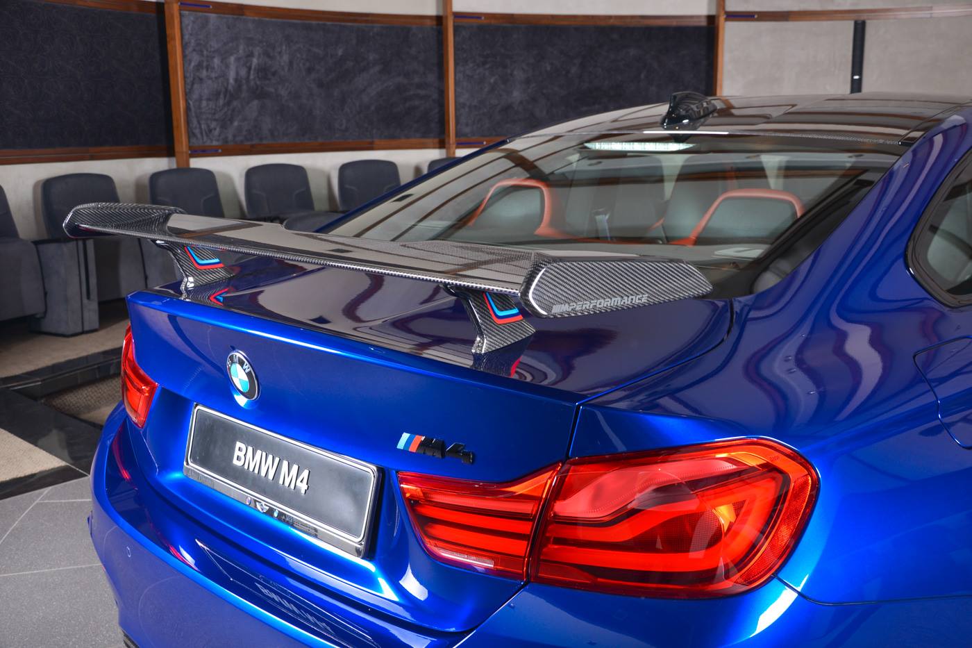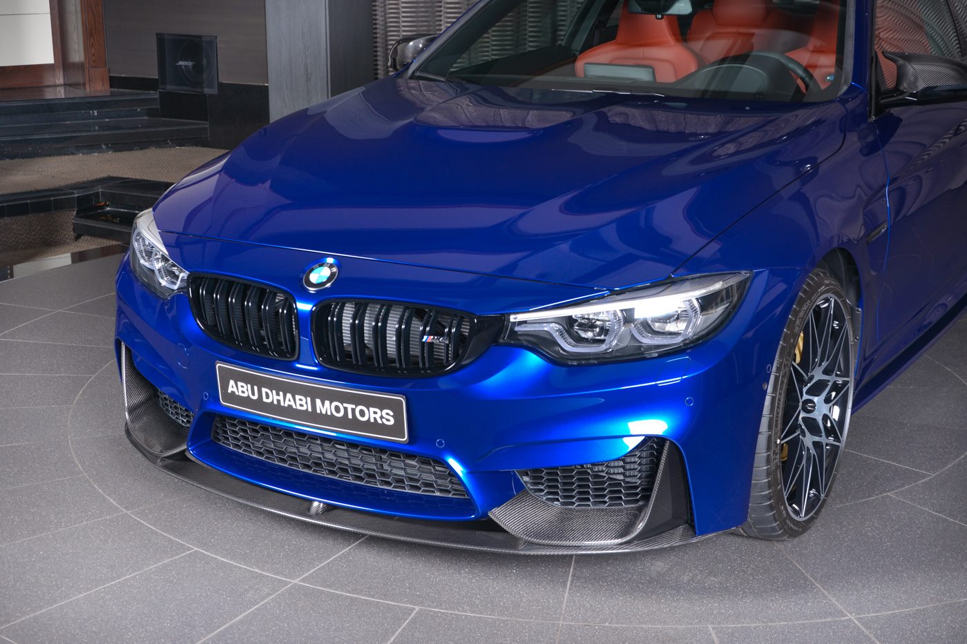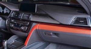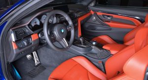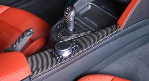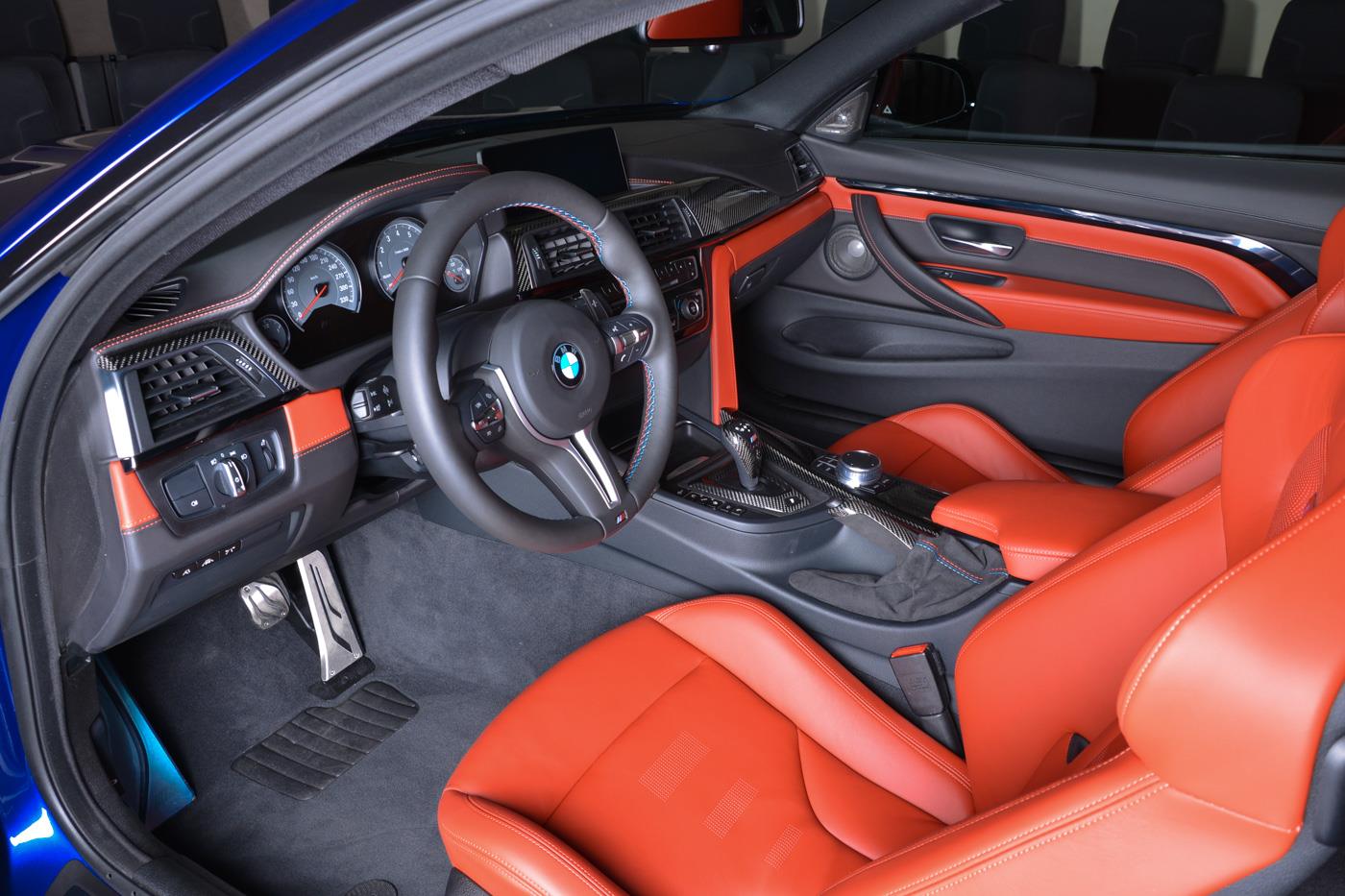 The M Performance body kit, and especially the carbon fiber rear wing, make this car, found at BMW Abu Dhabi, look particularly aggressive. Apart from the wing, the kit consists of a carbon fiber front spoiler, mirror covers and boot lid spoiler, but also some carbon inside on the gear selector, handbrake lever, console and dash, a leather interior in orange and dual tone silver and blue wheels.