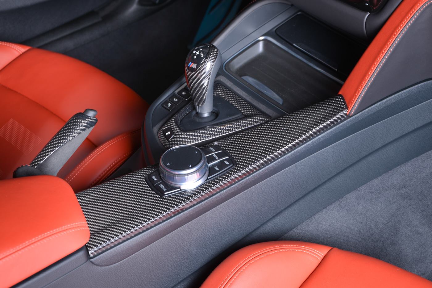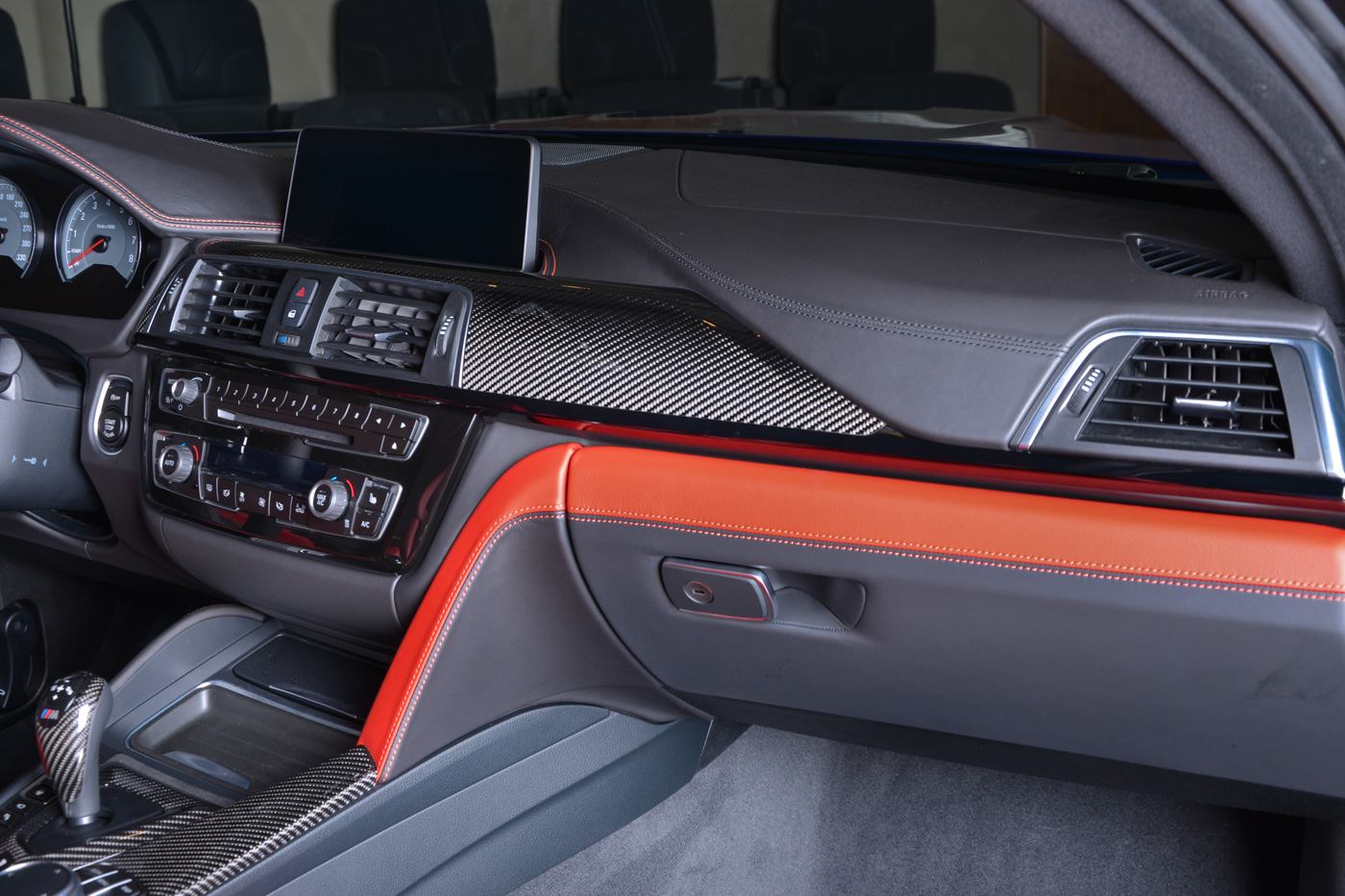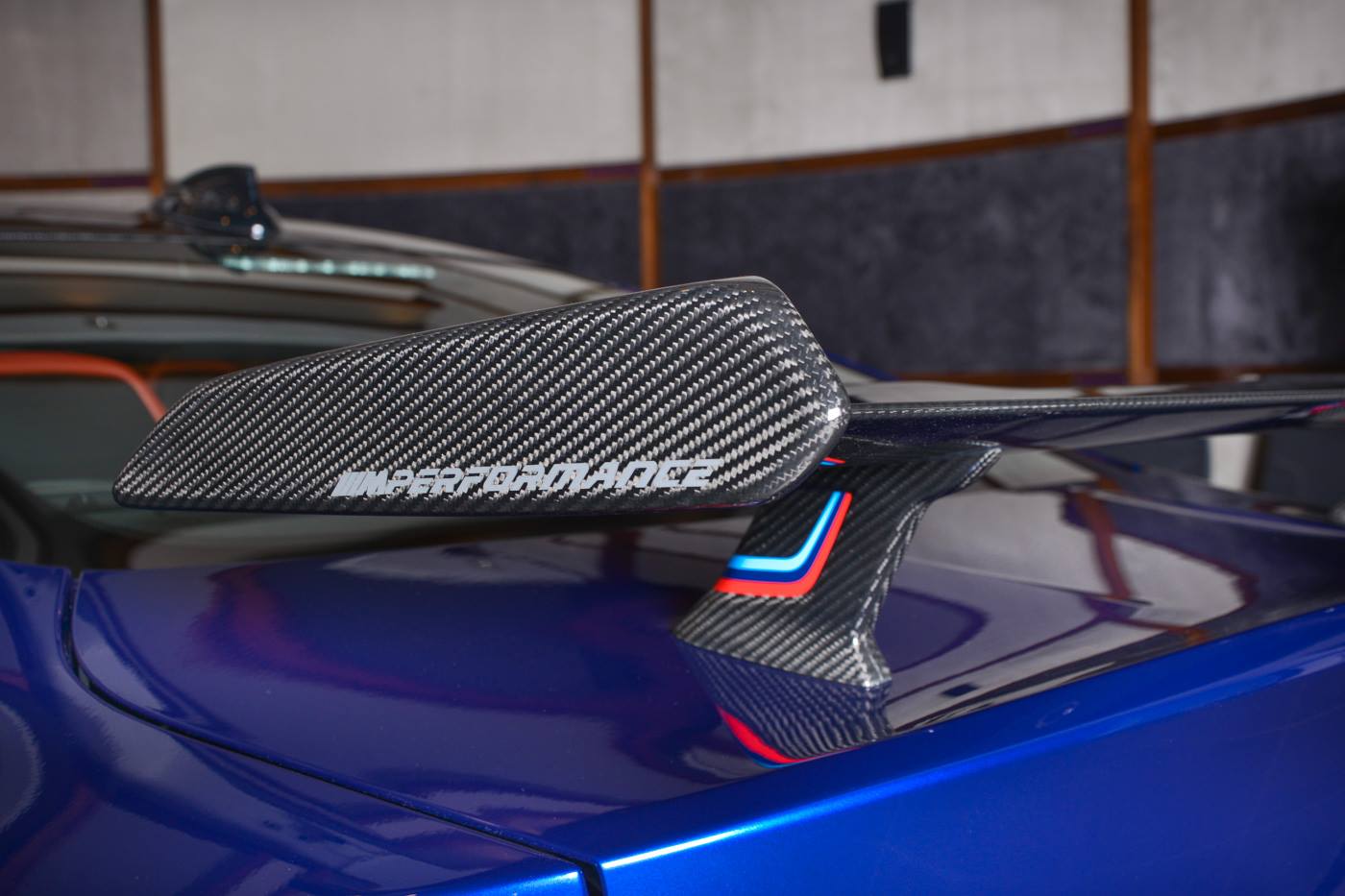 The M Performance body kit, and especially the carbon fiber rear wing, make this car, found at BMW Abu Dhabi, look particularly aggressive. Apart from the wing, the kit consists of a carbon fiber front spoiler, mirror covers and boot lid spoiler, but also some carbon inside on the gear selector, handbrake lever, console and dash, a leather interior in orange and dual tone silver and blue wheels.
