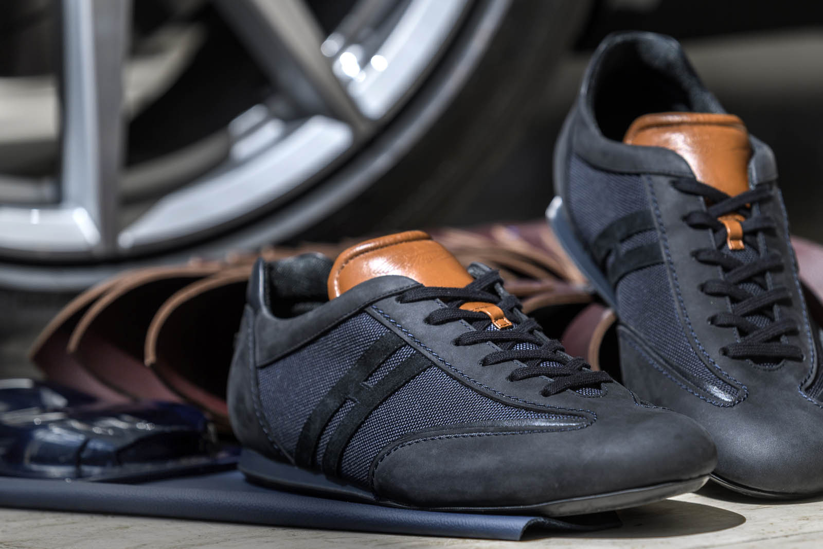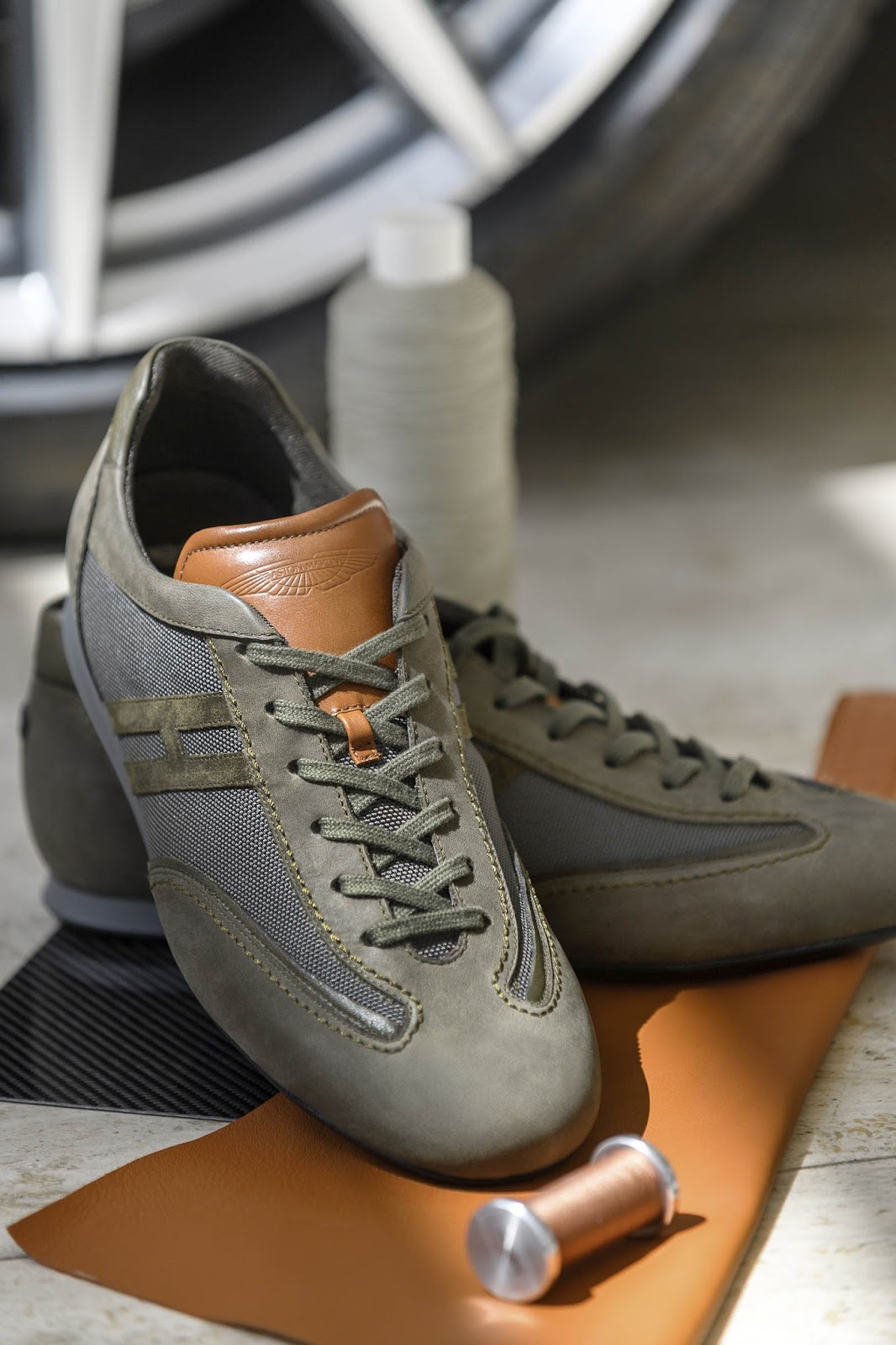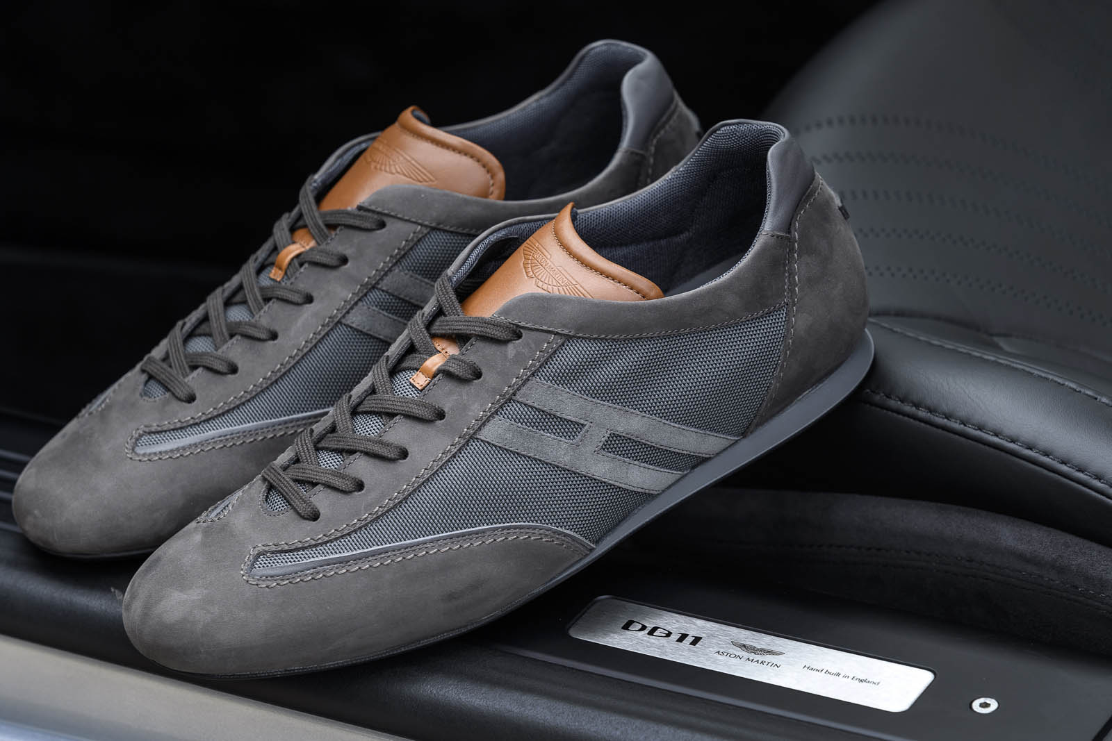 The leather kicks are made in collaboration with Italian shoemaker Hogan and are based on the latter’s Olympia model – but with unique Aston Martin flair. They combine nylon mesh inserts for a sportier look and feel, together with their leather construction that includes elements made by the same craftsmen that upholster the interior of so many Vantages and Vanquishes in such exquisite style.