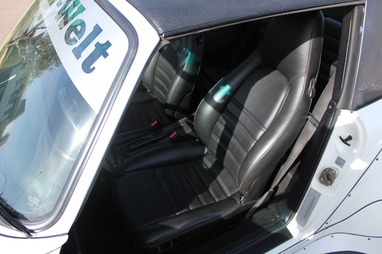 As you can see, the white 964 Targa boasts a full widebody kit, including heavily blistered wheel arches, DTM-style aero flicks on the front corners and a pronounced ducktail spoiler. With a five-speed gearbox and rear-wheel drive, it also has a Stage 2 Hakama aftermarket kit, V3 coilover suspension, and 18-inch Floss Designs alloys in a brushed bronze finish, and a thoroughly modern infotainment system with a touchscreen display and backup camera – features that Porsche itself would only offer years later.