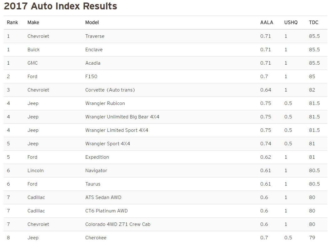 Unsurprisingly, the highest ranked vehicles in the study were “made by U.S. based manufacturers using American engines and transmissions, and a with a high American Automotive Labeling Act (AALA) percentage of U.S. and Canadian parts.”
