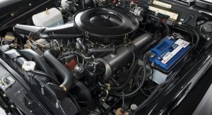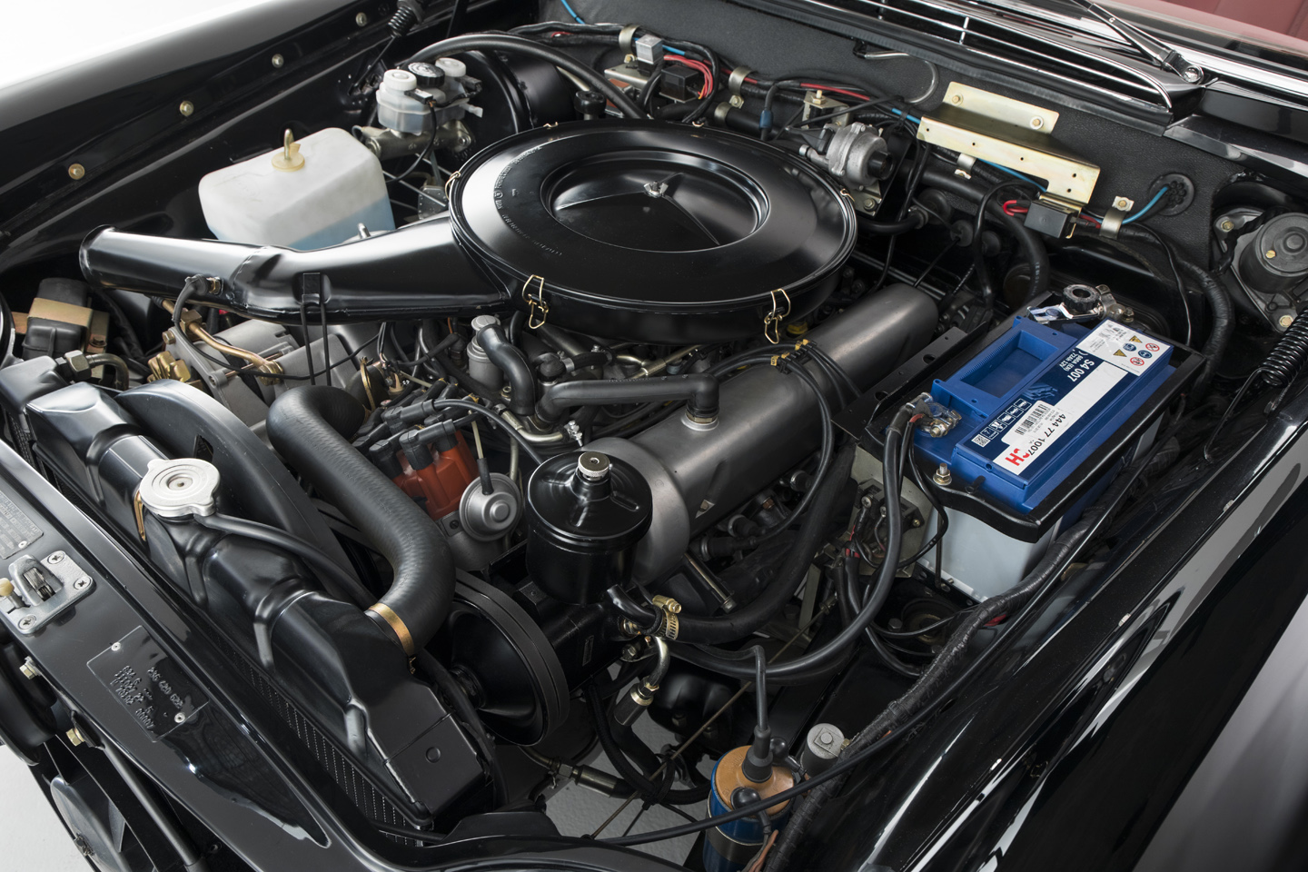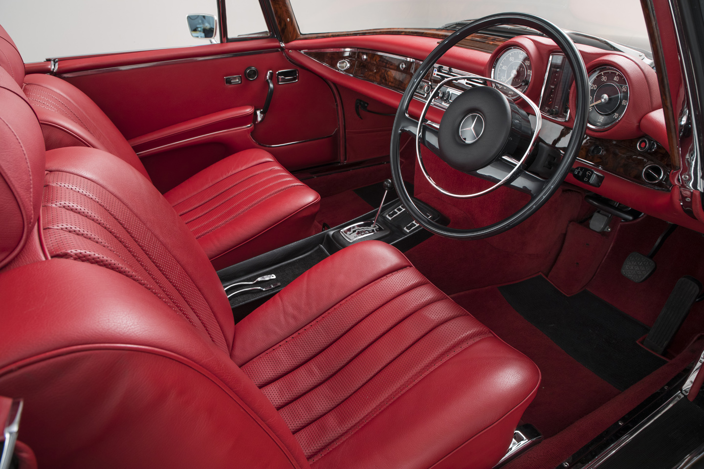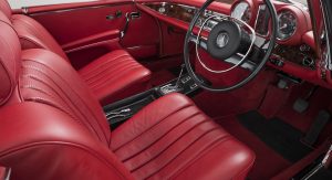 The car is said to have ‘excellent sound-deadening’, a ‘quiet V8 engine’ and a 4-speed automatic gearbox, which allow it to cruise ‘at today’s elevated speeds’. Moreover, this classic Merc’ has power steering, power windows, front headrests, and a gorgeous black paintwork, on top of a contrasting red leather interior.