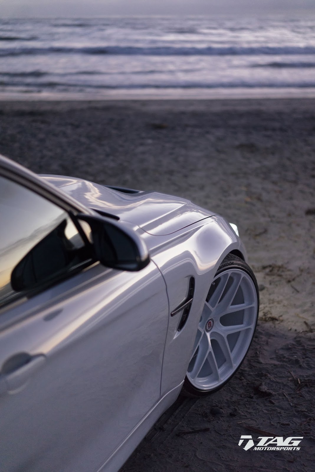 Elsewhere, the car sits on a set of HRE R101 lightweight wheels measuring 20×10 up front and 20×12 at the rear and finished in gloss white. Putting white wheels on a white car isn’t done very often but in this case, it works surprisingly well, at least to our eyes.