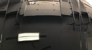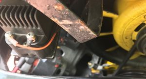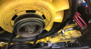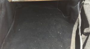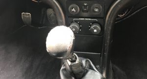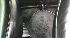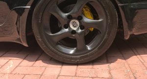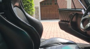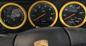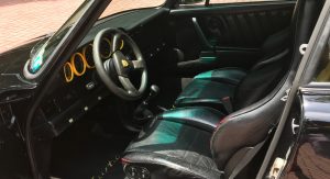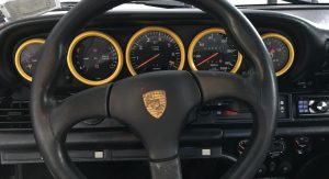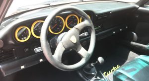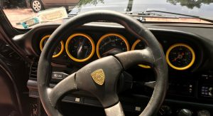 Inside, it’s got some wear on the black leather upholstery as well as on the 930S steering wheel, plus a padded roll cage covered in a carbon wrap. Other features include yellow instrument bezels and an Alpine head unit.