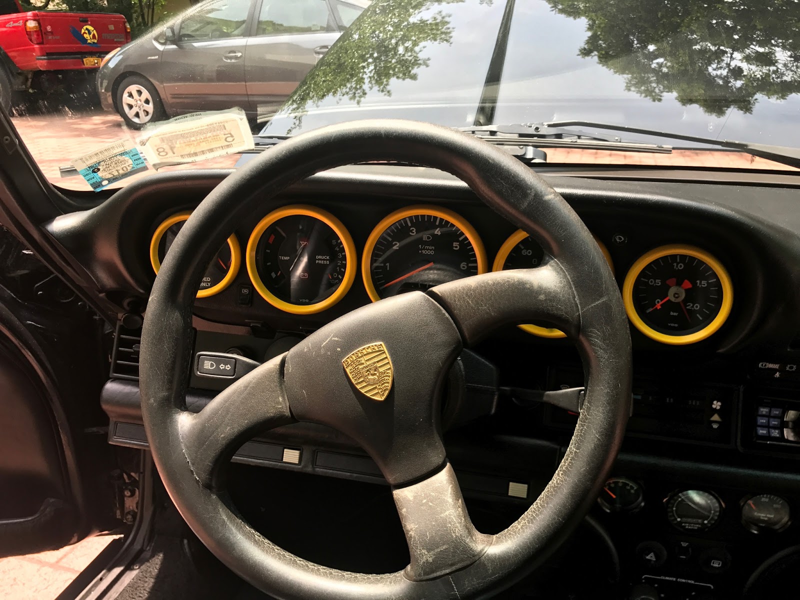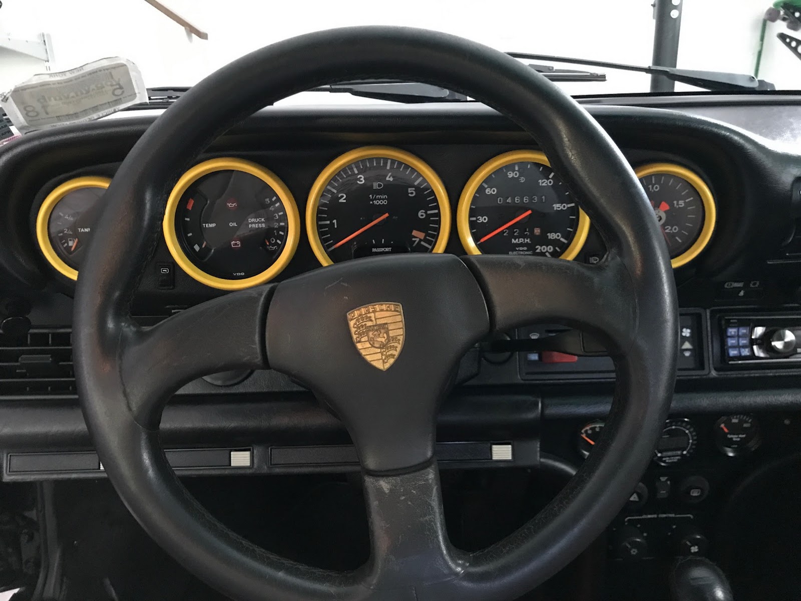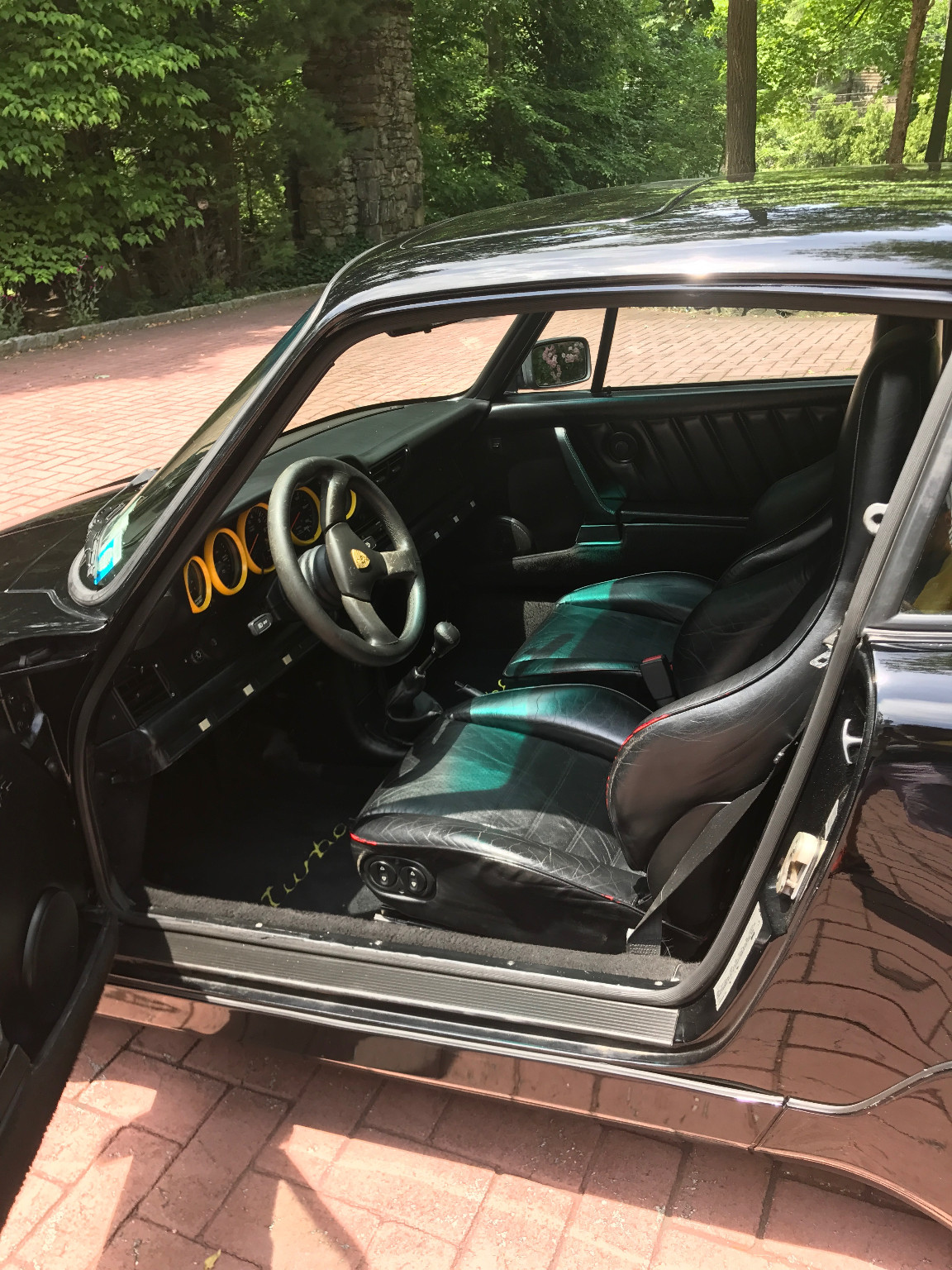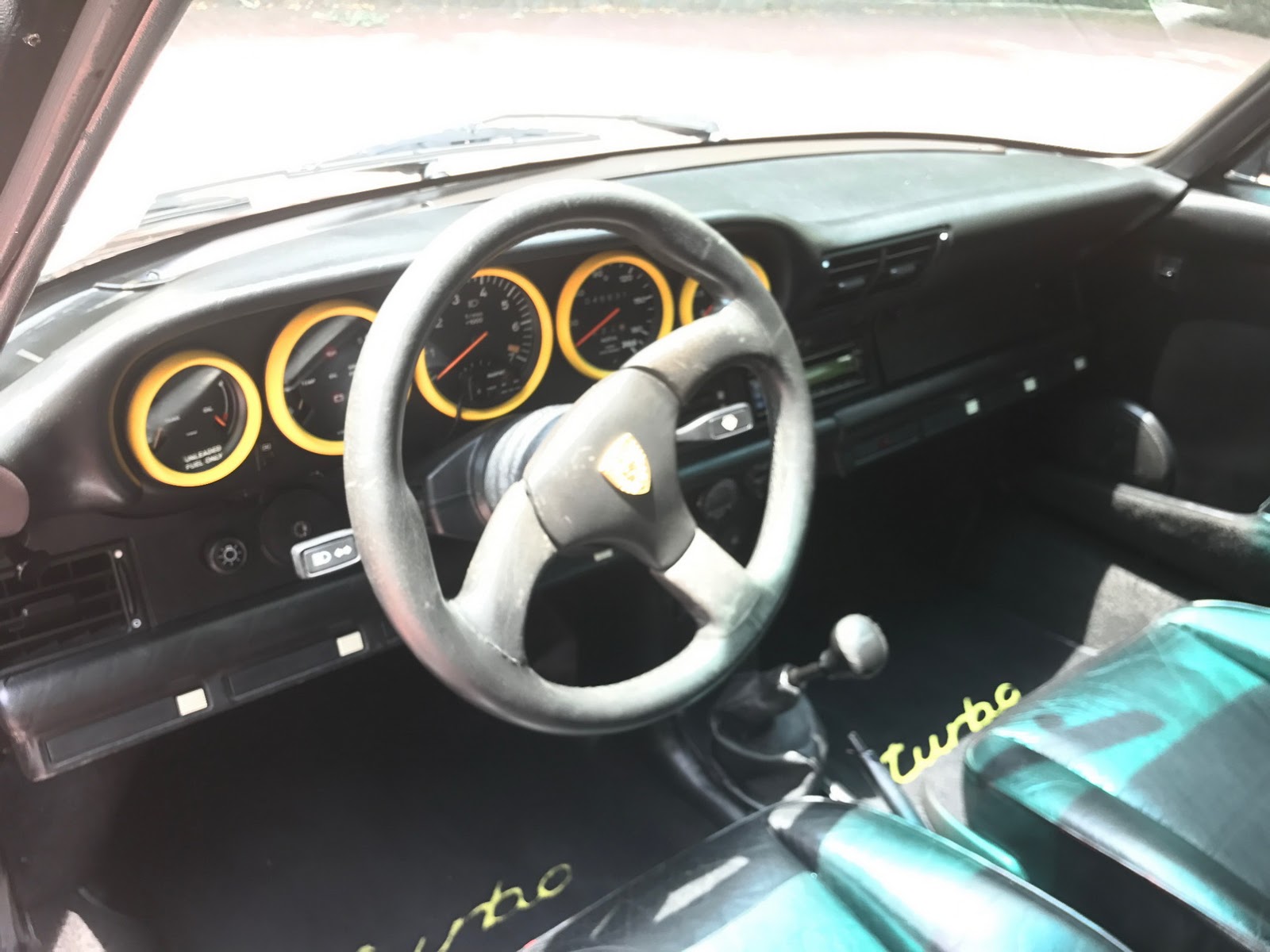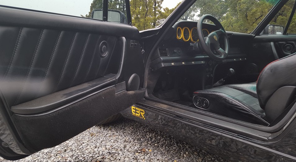 Inside, it’s got some wear on the black leather upholstery as well as on the 930S steering wheel, plus a padded roll cage covered in a carbon wrap. Other features include yellow instrument bezels and an Alpine head unit.