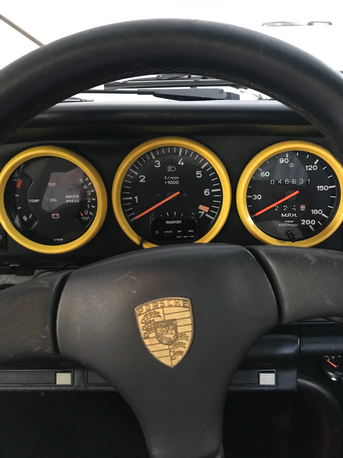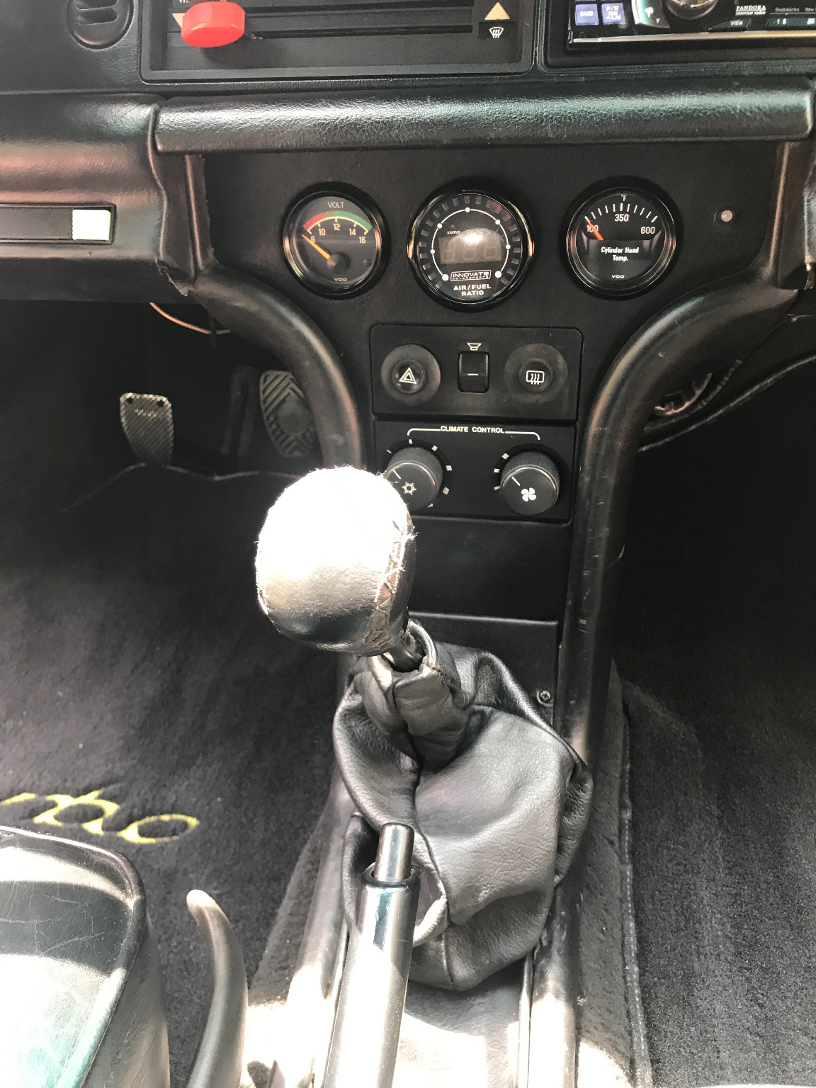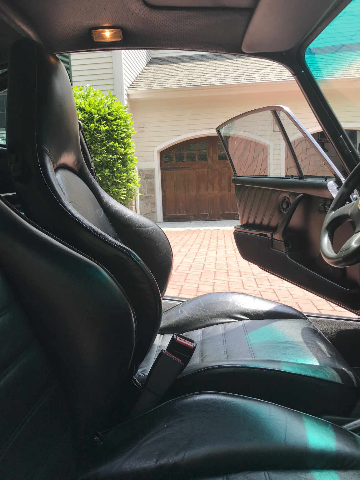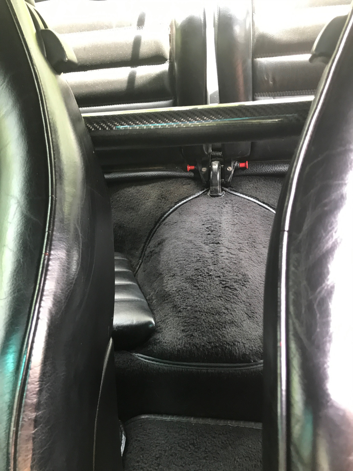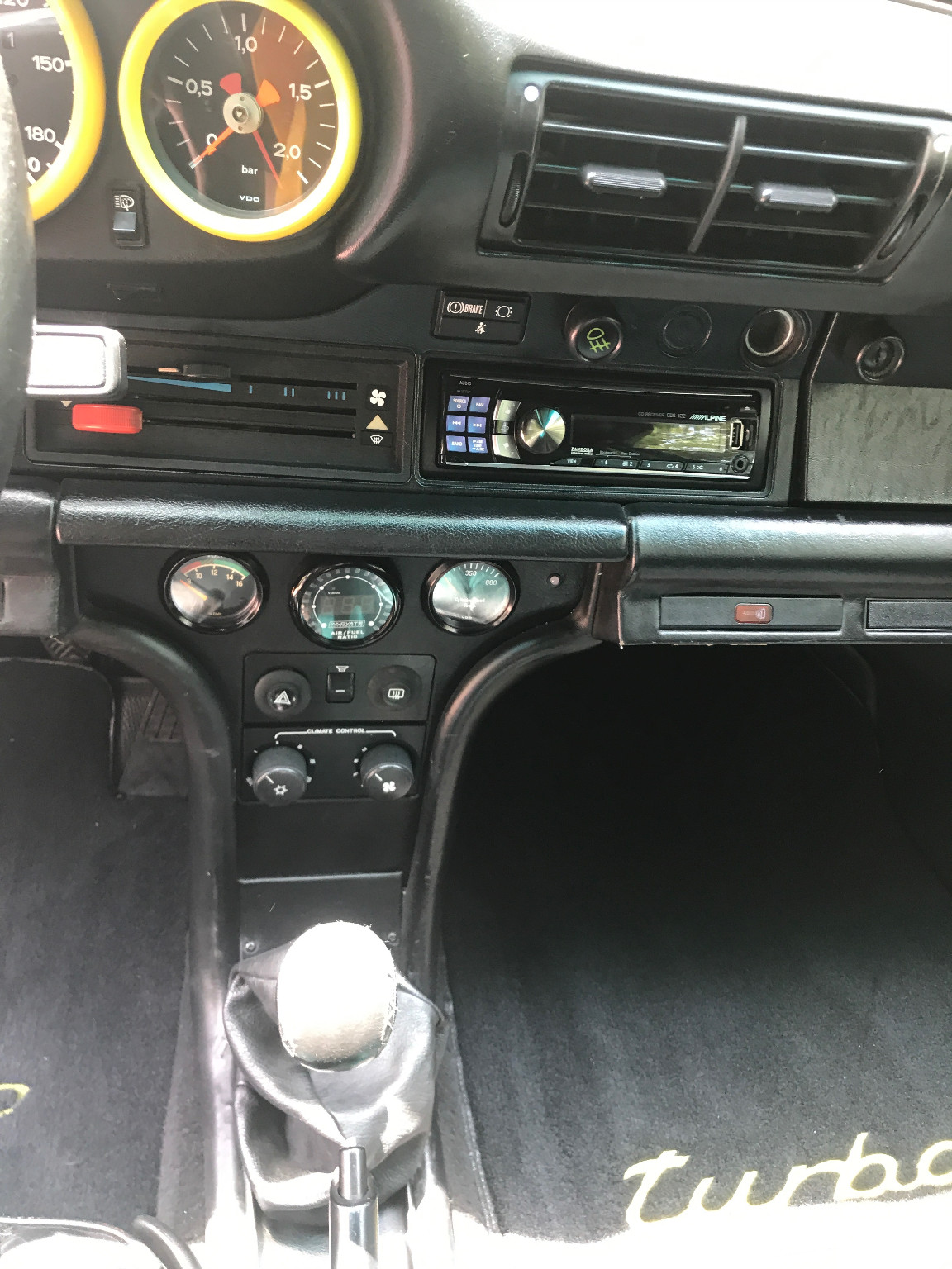 Inside, it’s got some wear on the black leather upholstery as well as on the 930S steering wheel, plus a padded roll cage covered in a carbon wrap. Other features include yellow instrument bezels and an Alpine head unit.