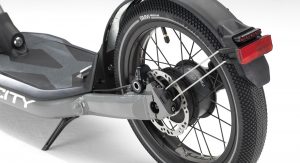 It has disc brakes and pneumatic tires at both ends to make it easy and comfortable to use, and even has a micro-USB charging port for keeping your cellphone topped up on the go. The removable battery is shielded from puddles, as is the rider (thanks to the fenders) – so there’s no need for special gear (as long as the rain’s stopped). And while a helmet’s always a good thing, the scooter’s classified under European Pedelec25 rules, so anyone over 14 needs neither license nor helmet to operate.