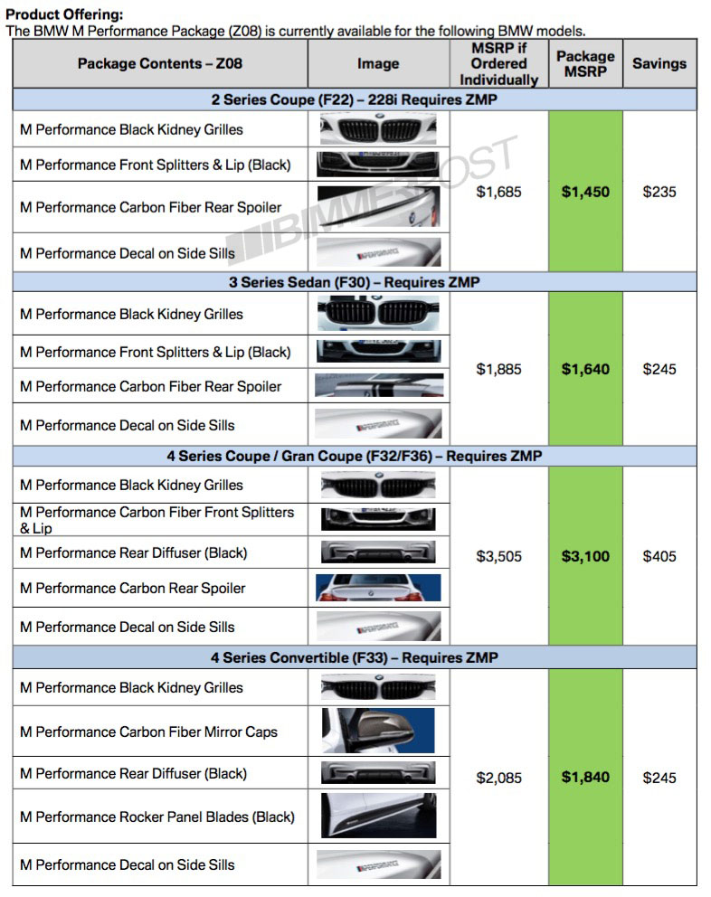 Uncovered by Bimmer Post, they start with the 2-Series which can now be ordered with black kidney grilles, a new front splitter, carbon fiber rear spoiler and M Performance decals on the side sills. Purchased individually, these add-ons amount to $1,685 but when bought together, that price falls to $1,450.
