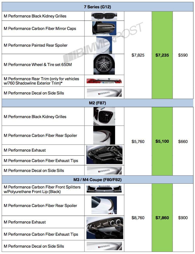 The new parts conclude with the M2, M3 and M4 models. The M2 is offered with black kidney grilles, a carbon rear spoiler, M Performance exhaust, carbon fiber exhaust tips and side sill decals, costing $5,100 all up.