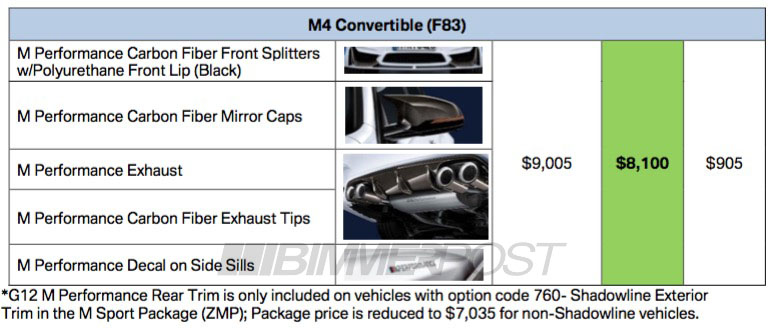 The M3 and M4 Coupe meanwhile can be ordered with carbon fiber front splitters, carbon rear spoilers, the same carbon-tipped exhaust system and decals. All of this goodness comes for $7,860. M4 Convertible owners are also offered carbon fiber mirror caps.