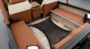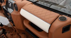 As rugged as the exterior of this customized Land Rover Defender might seem, the interior is the exact opposite, with a focus on luxury and personalized color combinations.