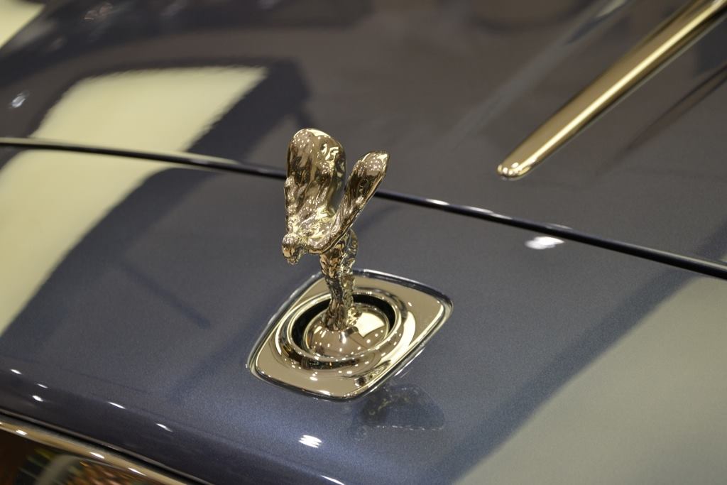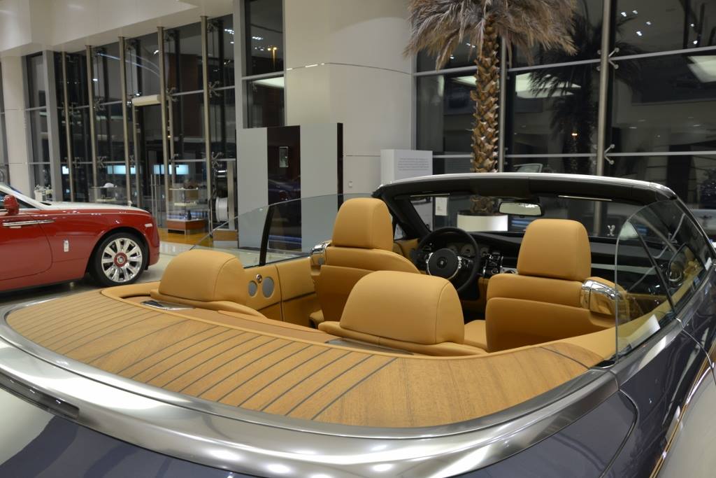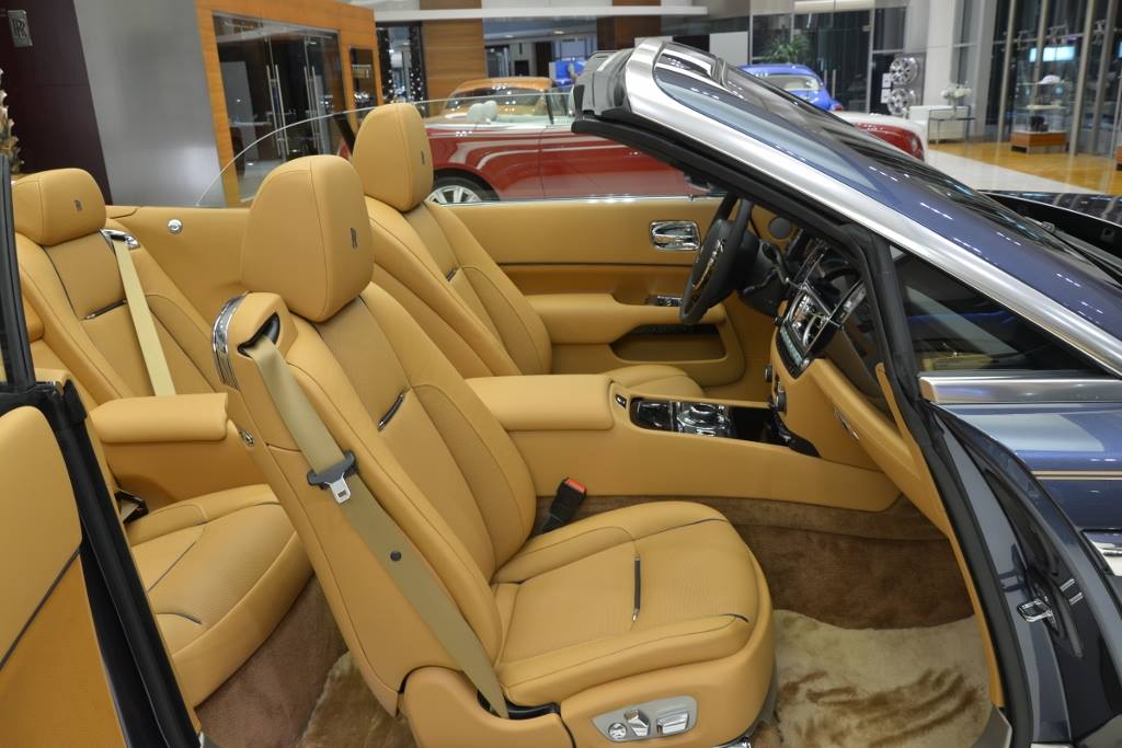 This particular car, on display at the automaker’s Abu Dhabi showroom, features an Iguazu Blue exterior with gold stripes along the shoulder line, plus a custom Tan interior, with cream leather covering pretty much every surface from the upper dashboard downwards.