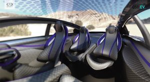 The steering wheel is particularly interesting though. First, you can hardly even call it a “wheel” since it’s shaped like something you’d see in a sci-fi movie where people take a left at the asteroid belt, instead of at a light. Second, it’s got a slim display embedded into the top part where you can see the car’s speed and presumably other bits of info as well.