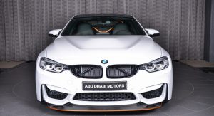 This particular car was photographed at BMW’s Abu Dhabi dealership, featuring a predominantly white exterior with orange accents and an Alcantara-rich cabin.
