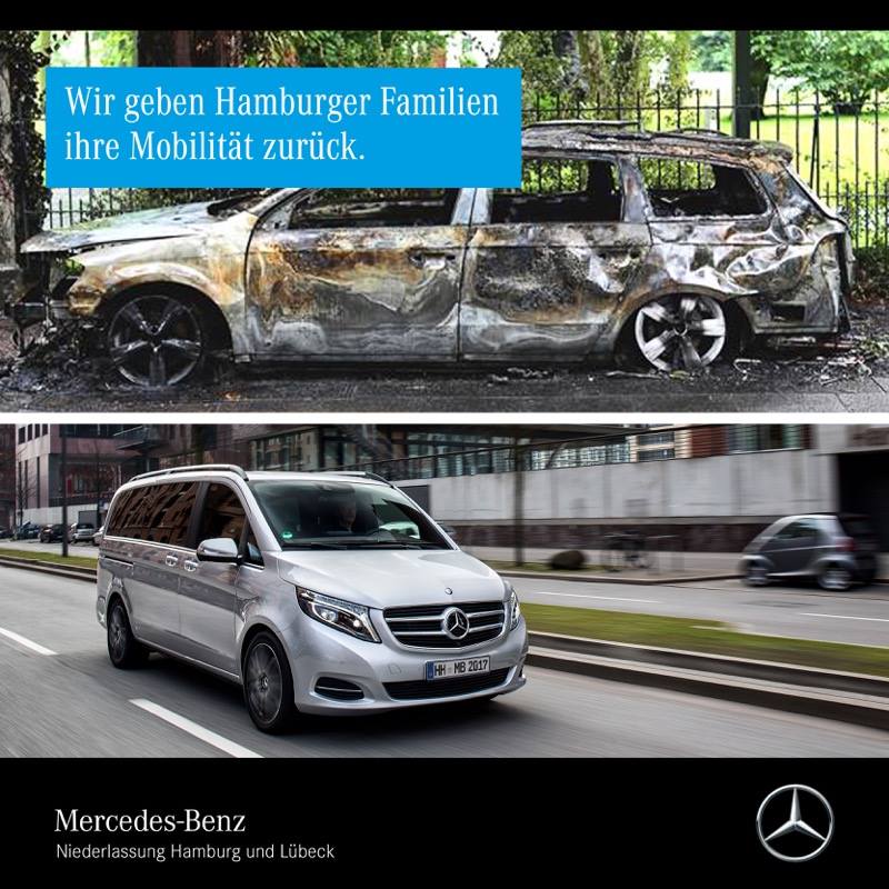 The announcement was made on social media, and it says: “We want to help families whose vehicles were destroyed during the G20 riots, over the weekend, and who depend on their mobility. For this reason, Mercedes-Benz Hamburg is now offering a total of five replacement vehicles. Affected families can report and describe their situation, no matter what brand they have driven.”