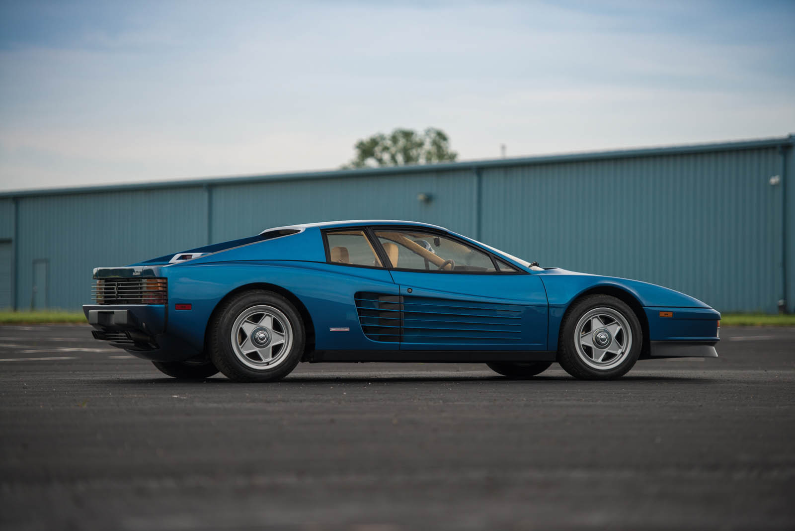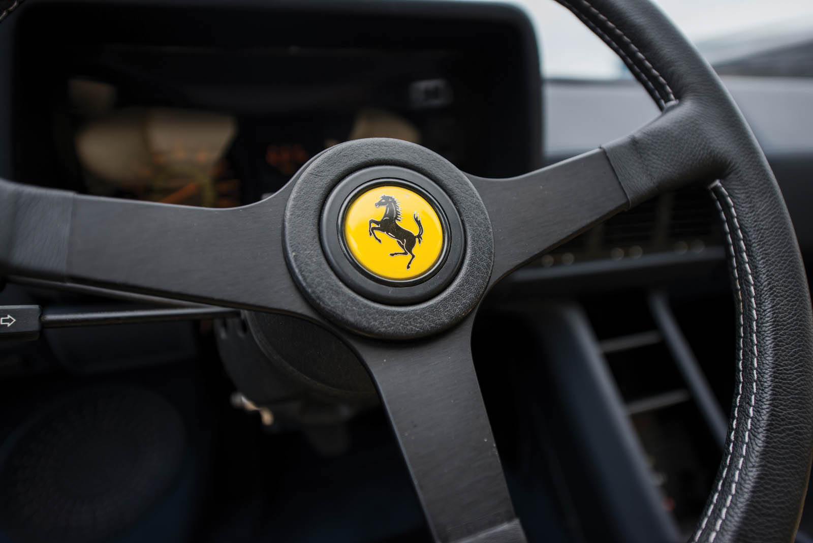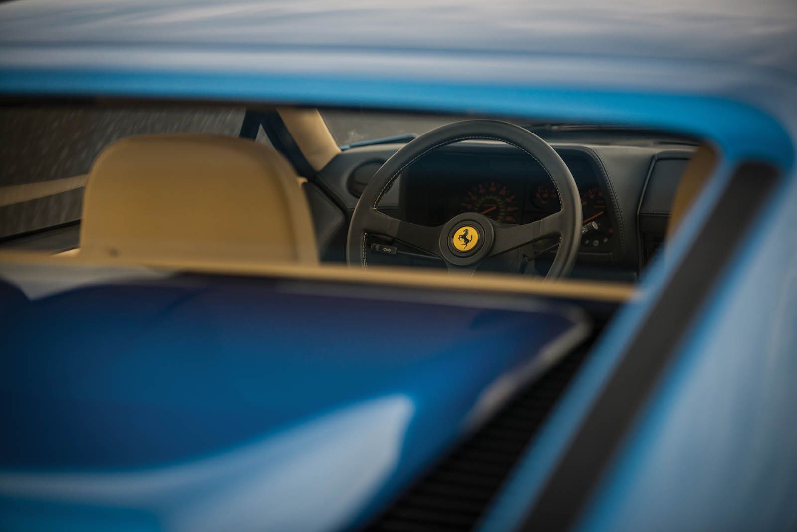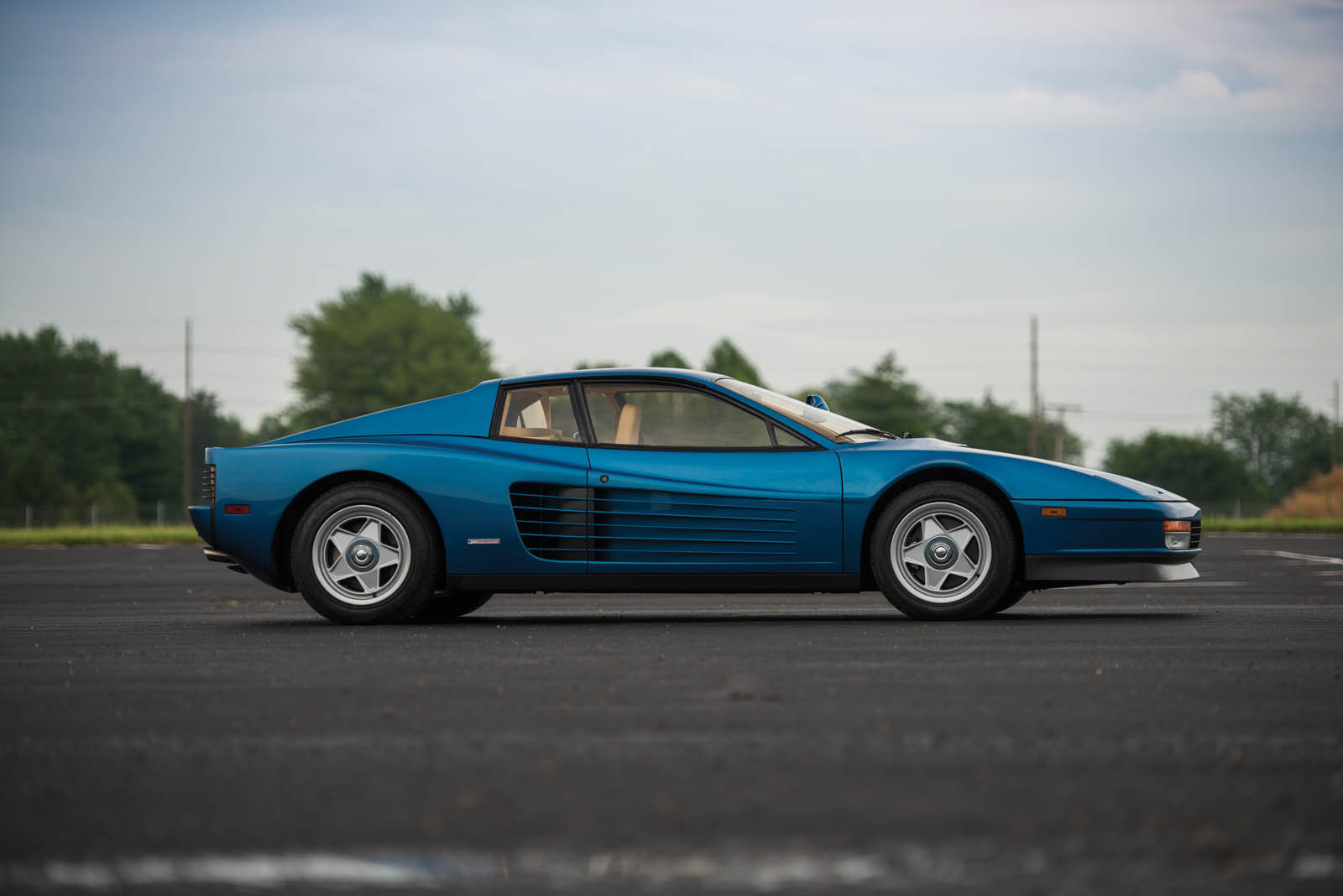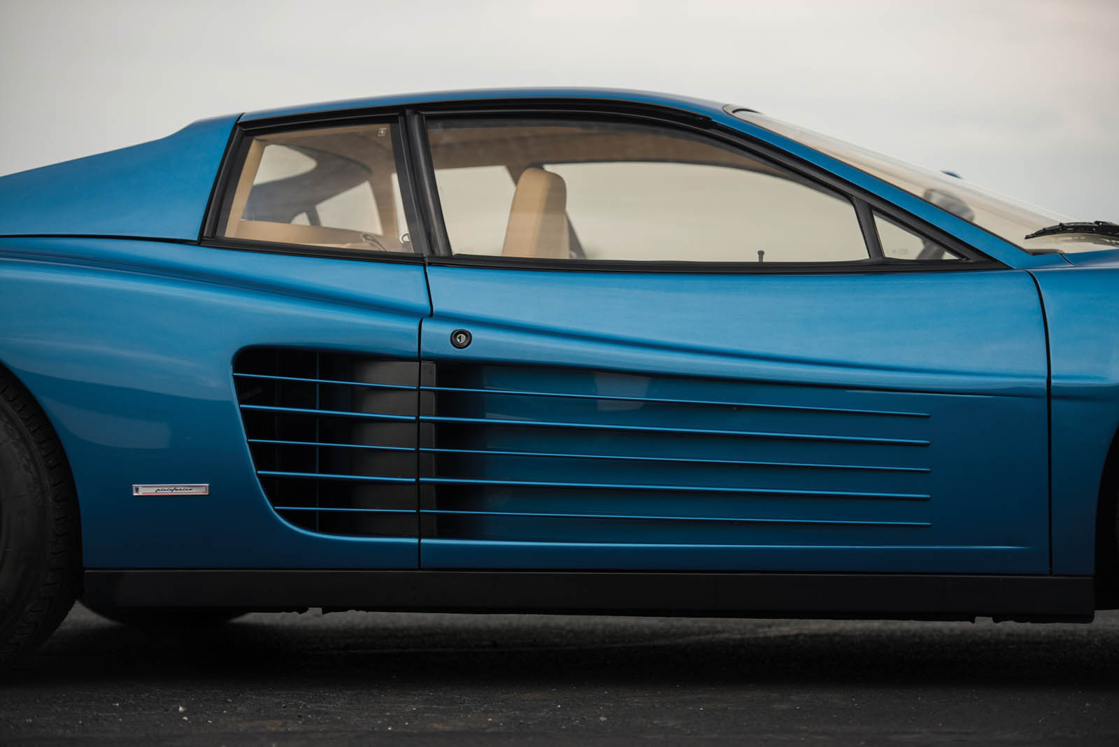 This ’86 Testarossa came in a rather elegant and understated combination or Blu Chiaro Metallizato with a two-tone cream and blue leather interior. It’s the only one with the single “monospecchio” side mirror believed to have been delivered in this unique combination in the United States.
