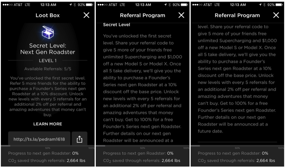 The loot box says “You’ve unlocked the first secret level. Refer 5 more friends for the ability to purchase a Founder’s Series next gen Roadster at a 10% discount. Unlock new levels with every 5 referrals for an additional 2% off per referral and amazing adventures that money can’t buy.”