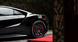 Look close and you’ll notice that there’s a red circular design element inserted behind the spokes, blending in with the red calipers and making the car seem like it has massive red brake discs.