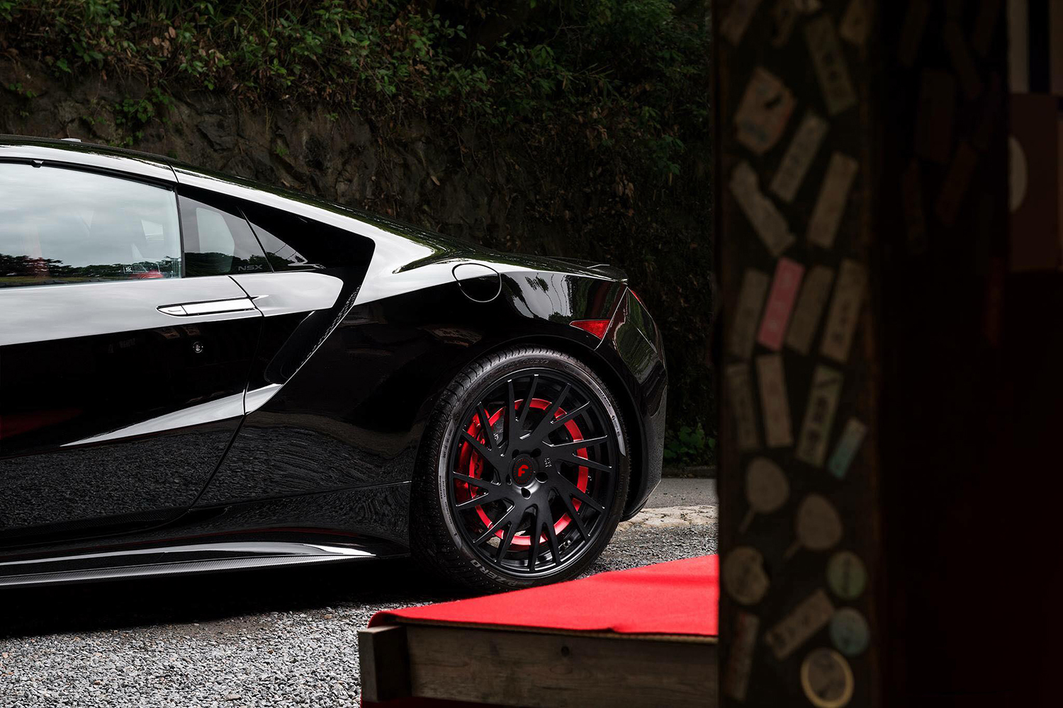 The background seems perfectly chosen for the this sinister-looking NSX, mixing a black exterior with dual-tone black and red Forgiato Tecnica 2.5-R wheels.