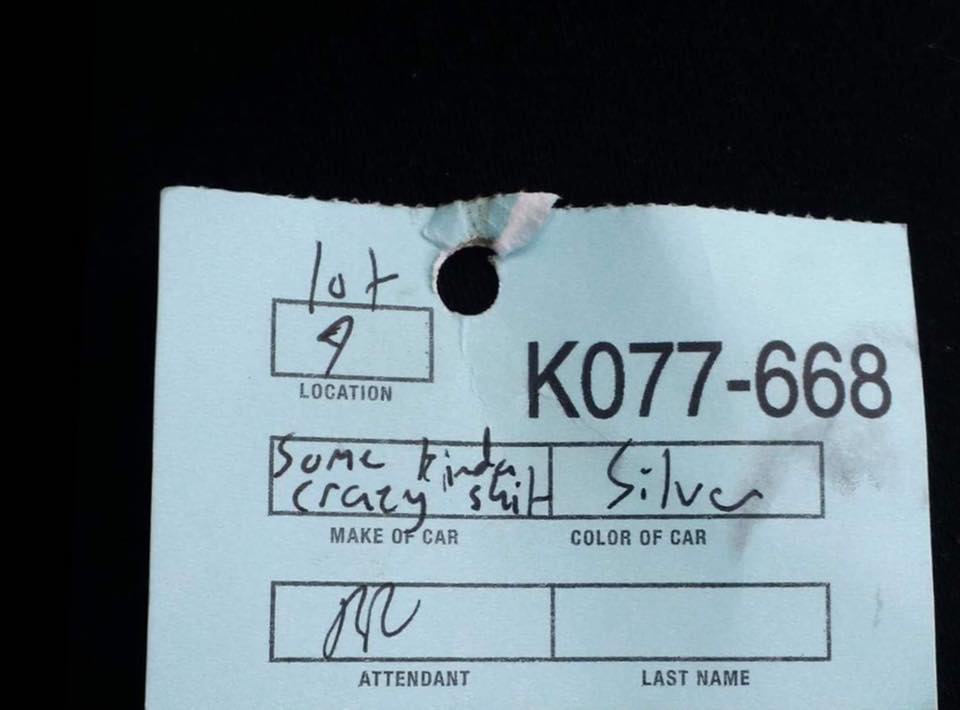 She had to use valet at the ER today to park it, and this is what they wrote on the tag….I haven’t stopped laughing since.”