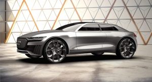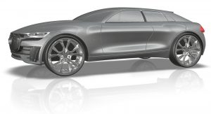 Limited inspiration has been taken from the Prologue Concept and Audi’s current design language. Instead, the front ditches a traditional grille entirely and solely consists of small air intakes and horizontal headlights. It’s not what you’d call pretty and borrows man of its design touches from the Audi e-Tron Sportback SUV concept.