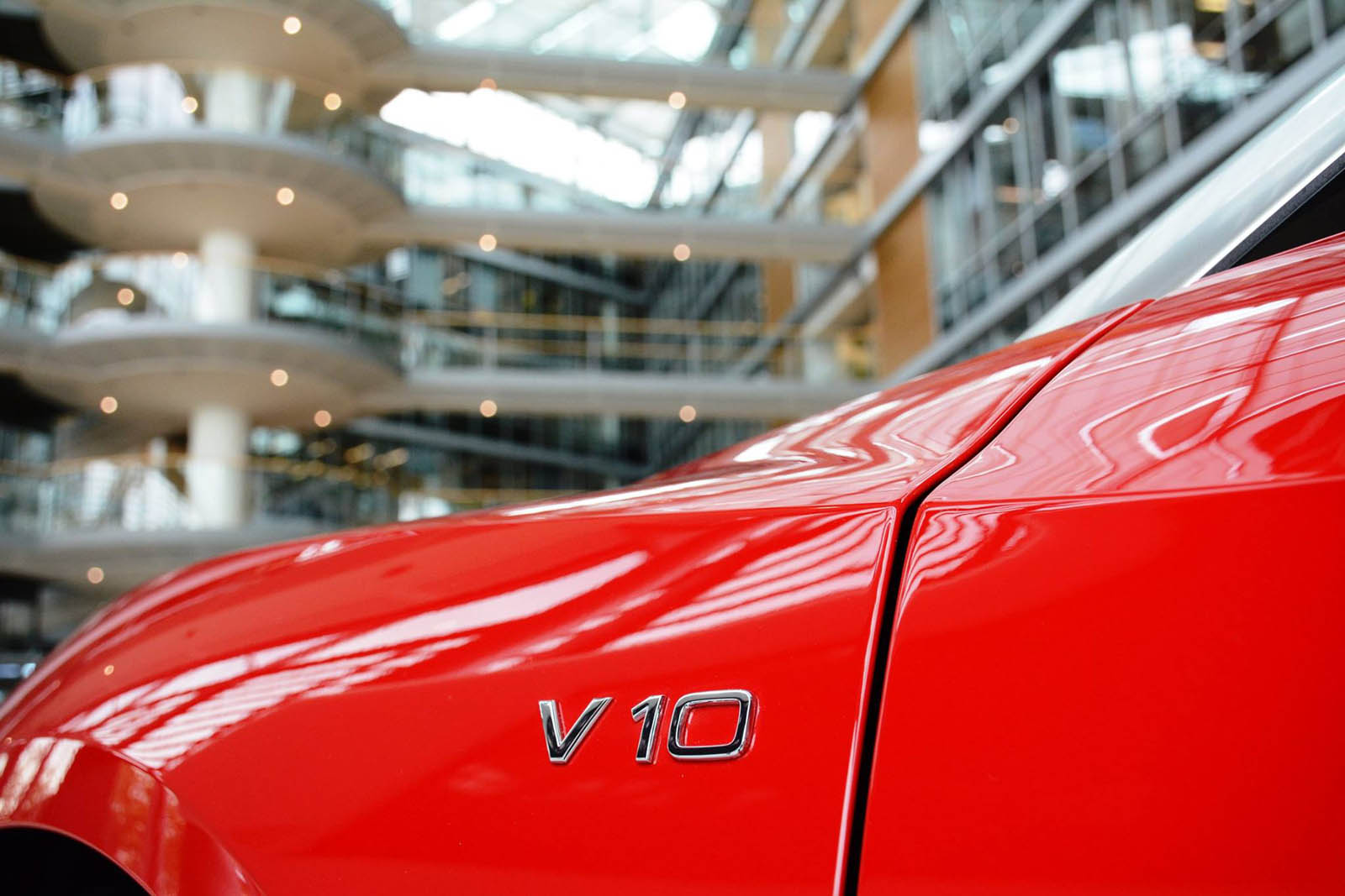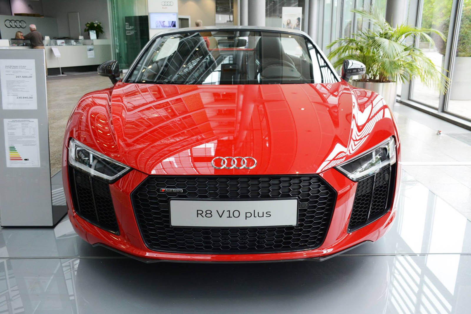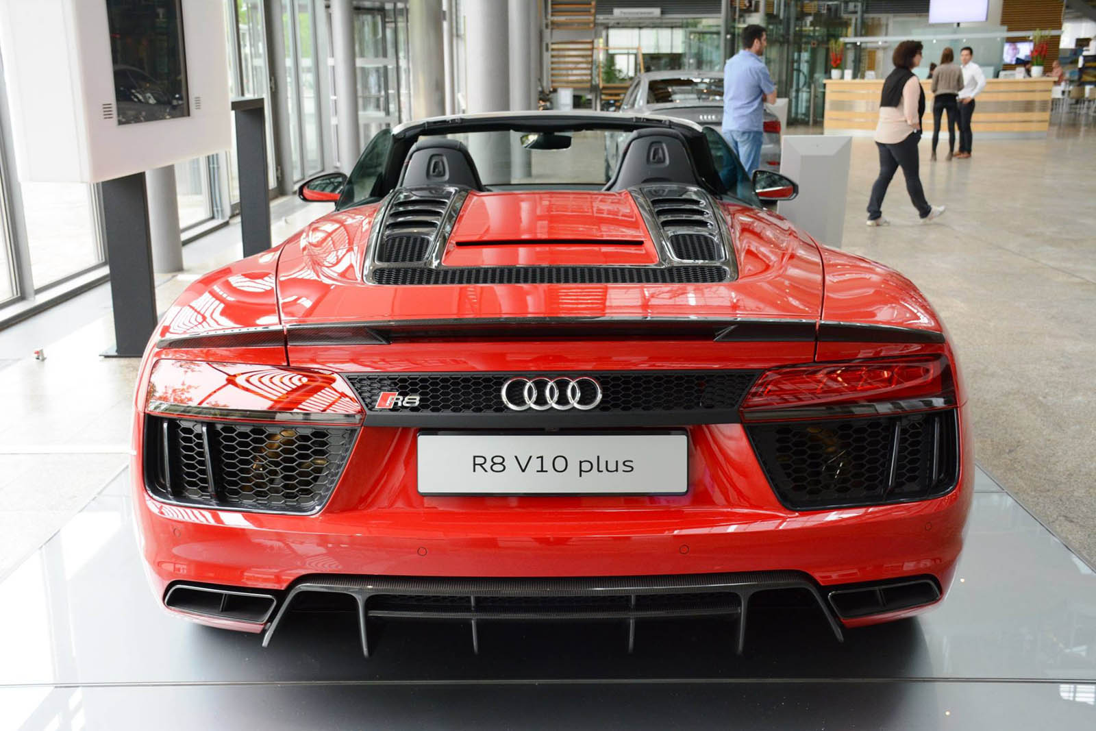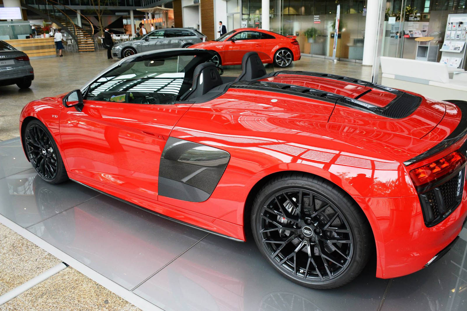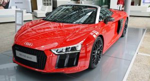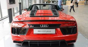 The new R8 Spyder V10 Plus is now on display at the Audi Forum in the automaker’s home town of Ingolstadt, resplendent in a suitably super shade of red with a silver windshield frame and red-stitched black leather interior.