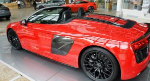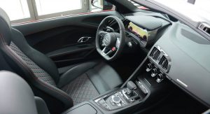 The top topless R8 packs a 5.2-liter V10 under its rear deck, good for 610 horsepower and 413 lb-ft of torque – channeled to all four wheels for a 0-62 run of 3.3 seconds and a top speed quoted at 204 Autobahn-crunching miles per hour.