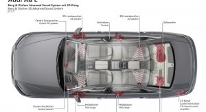 Boasting 23 loudspeakers, including four designed specifically for the spacial dimension of height, the Bang & Olufsen 3D Advanced Sound System is available for the new-generation Audi A8.